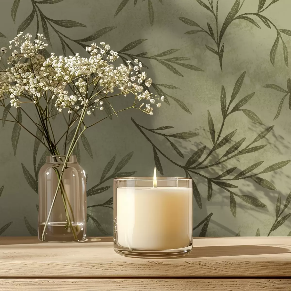 Tapetti Oliivipuun oksat hillityn kelta-vihreällä teksturoidulla pohjalla Nr. a00936