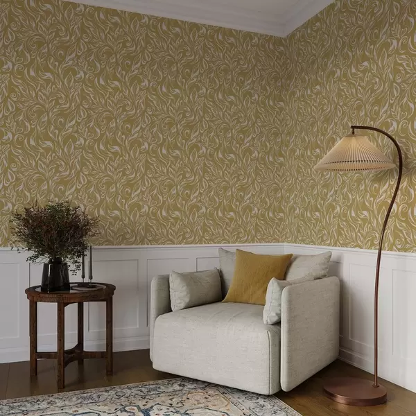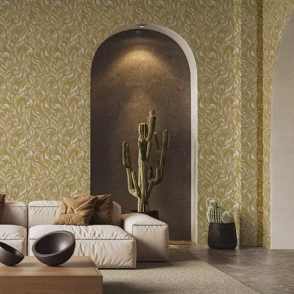 Tapetti Kermavalkoinen lehtikoriste lämpimällä okranvärisellä taustalla Nr. a00940v1