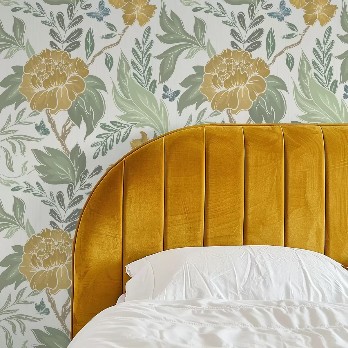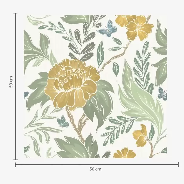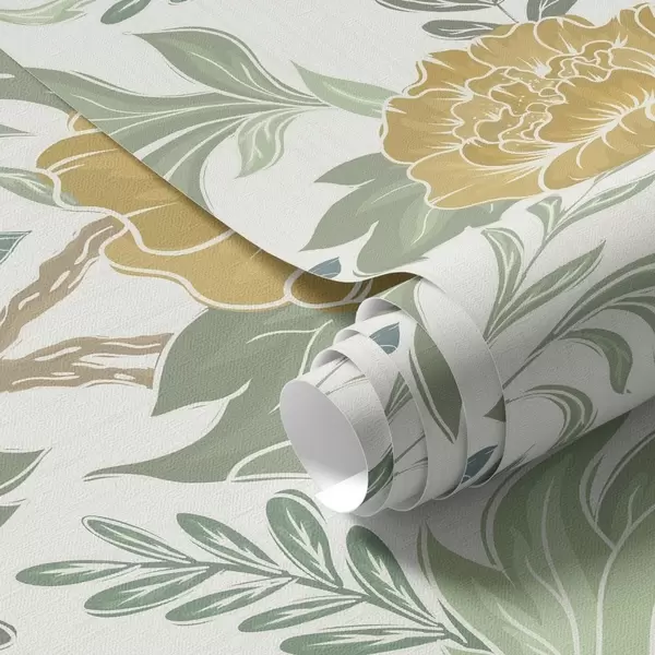 Tapetti Suuret keltaiset pionit ja vihreys vaalealla taustalla Nr. a00941