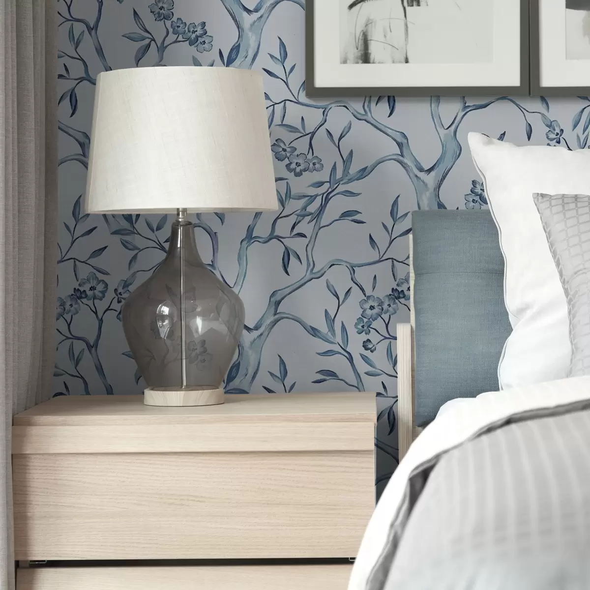 Tapetti Vesivärillä maalattuja sinisiä oksia, kukkia ja perhosia vaalealla taustalla Nr. a00951