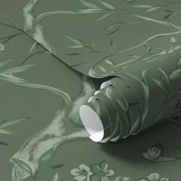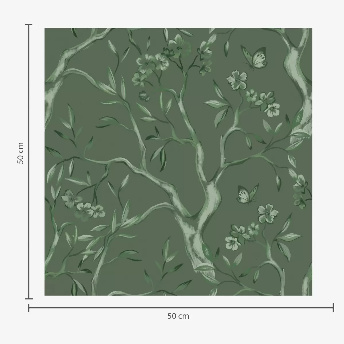 Tapetti Vihreät kukkivat oksat ja perhoset tummalla taustalla Nr. a00951v3
