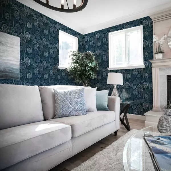 Tapetti Yömetsä, jossa on koristeellisia puita sinisissä sävyissä Nr. a00960v2