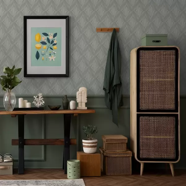 Tapetti Diagonaaliset viivat muodostavat neliöitä mintunharmaassa värimaailmassa Nr. a00983v1