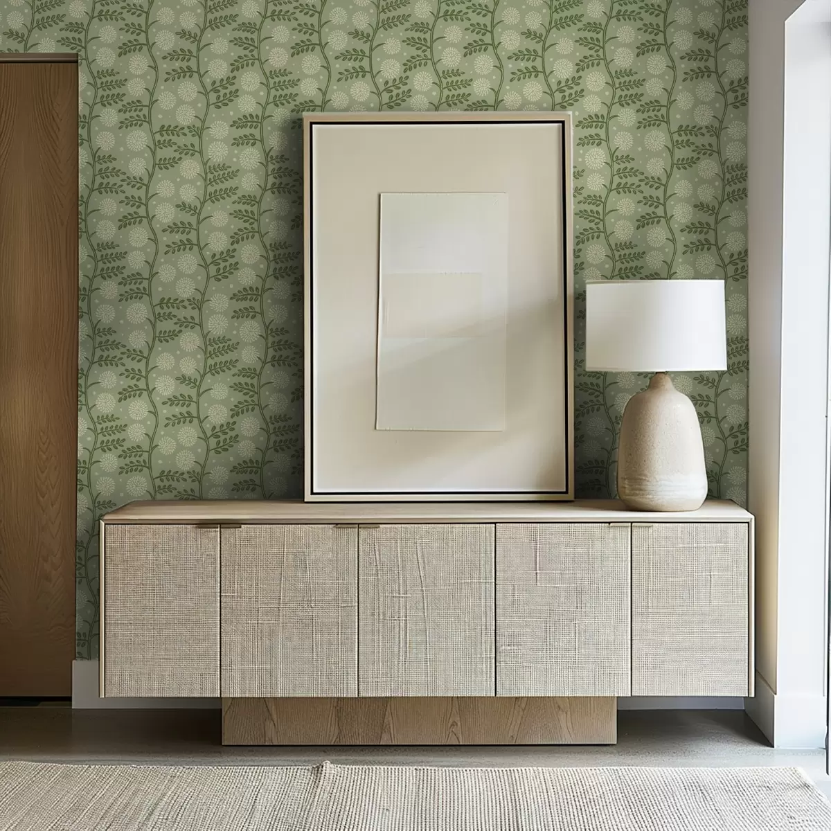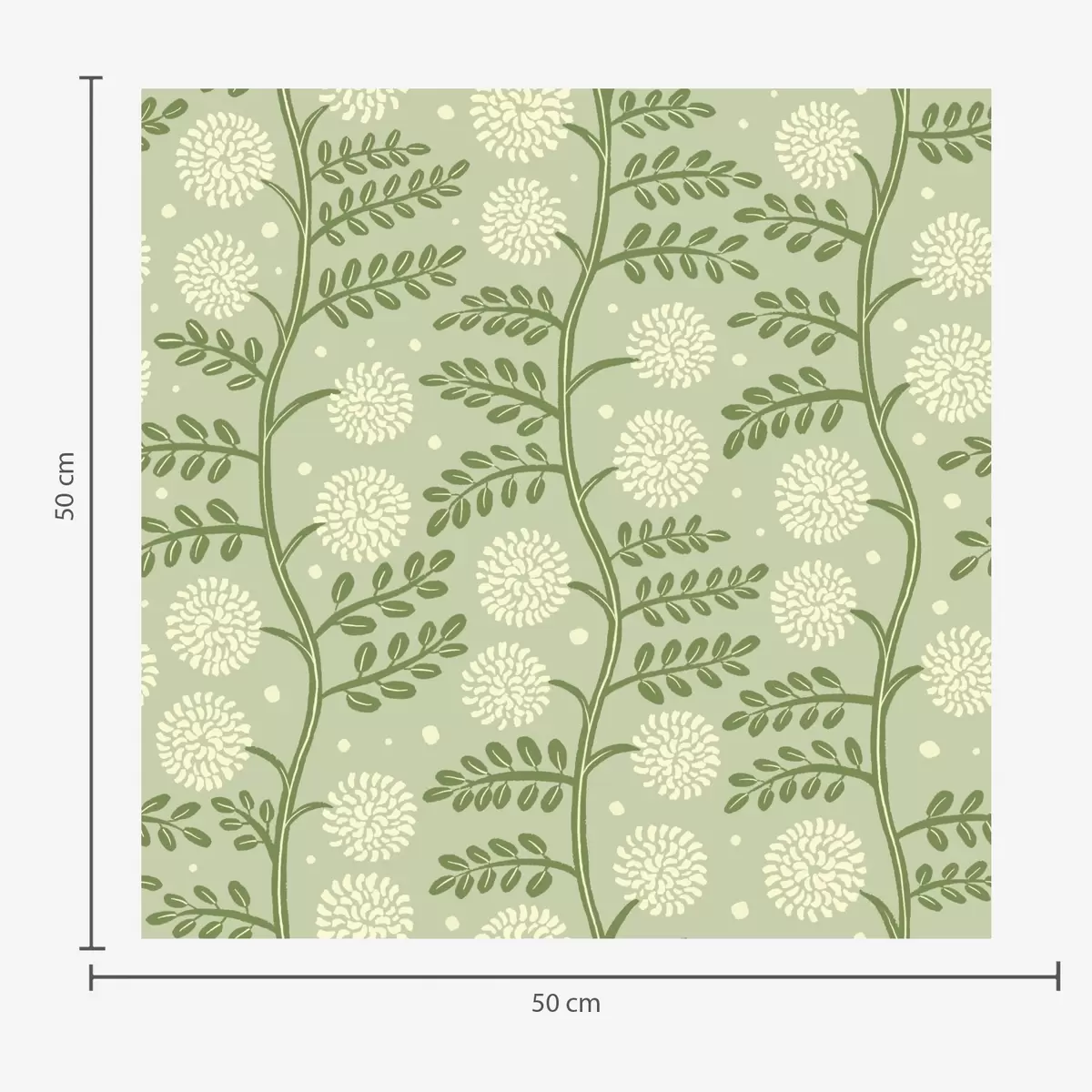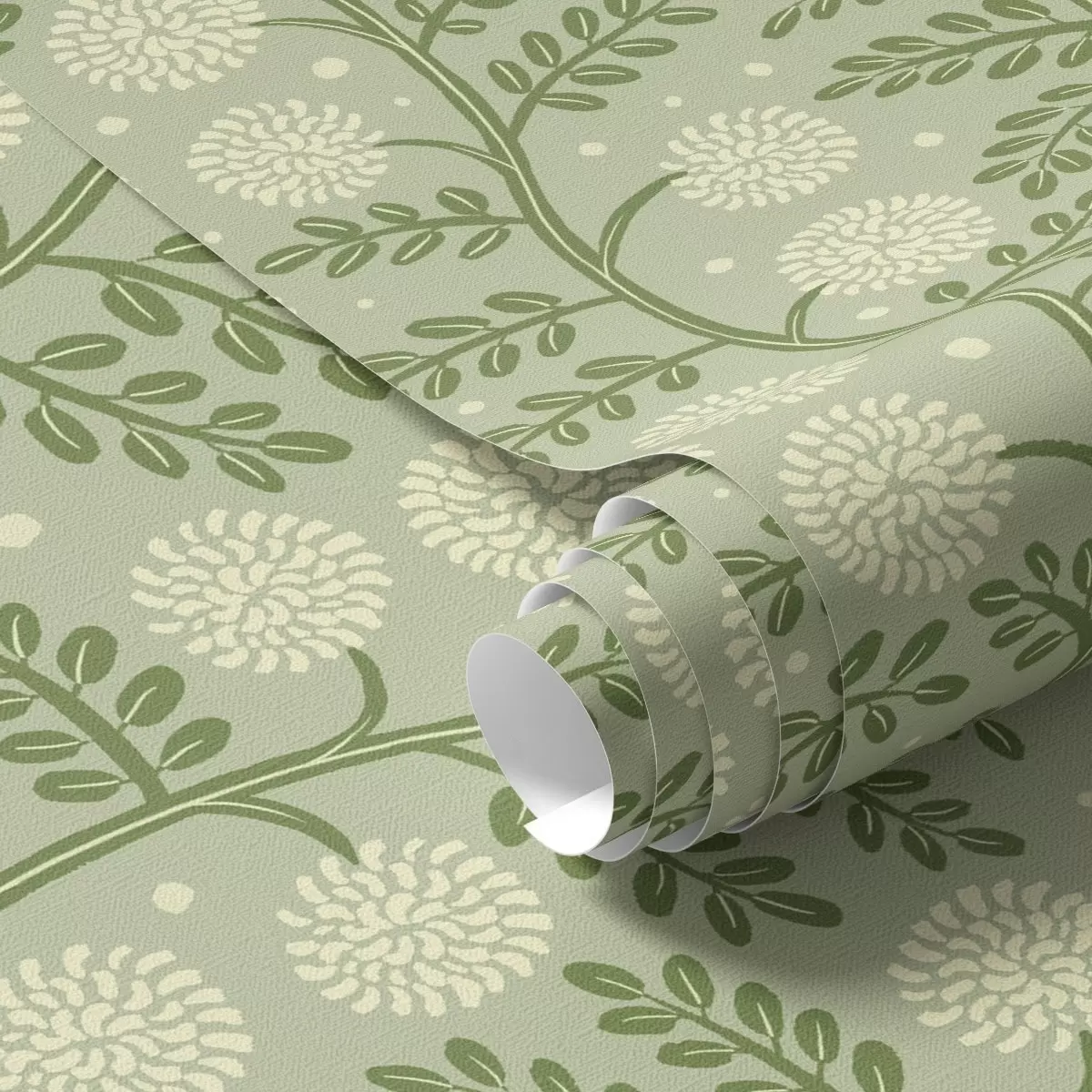 Tapetti Salviavihreät varret, joissa on norsunluunvärisiä pörröisiä kukkia ja pisteitä Nr. a00997v2