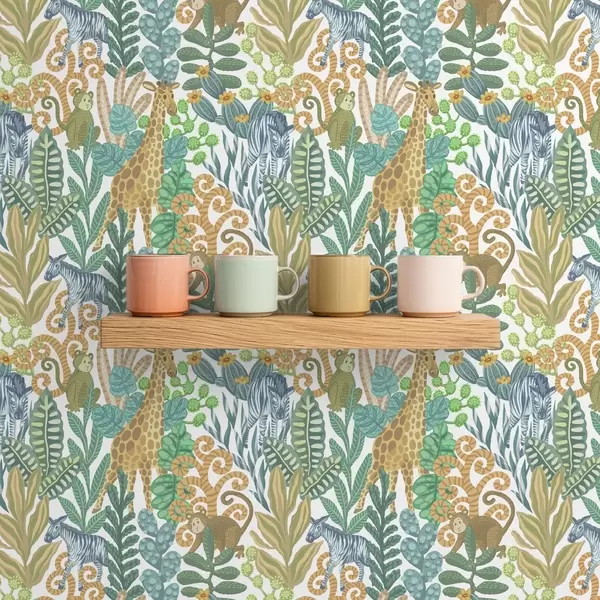 Tapetti Iloiset savannieläimet lehtien keskellä valkoisella taustalla Nr. a01000
