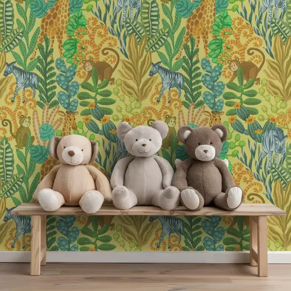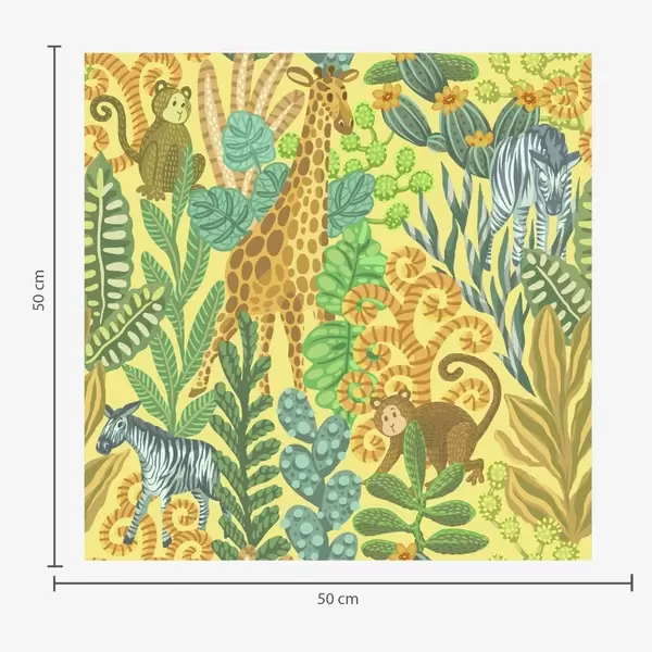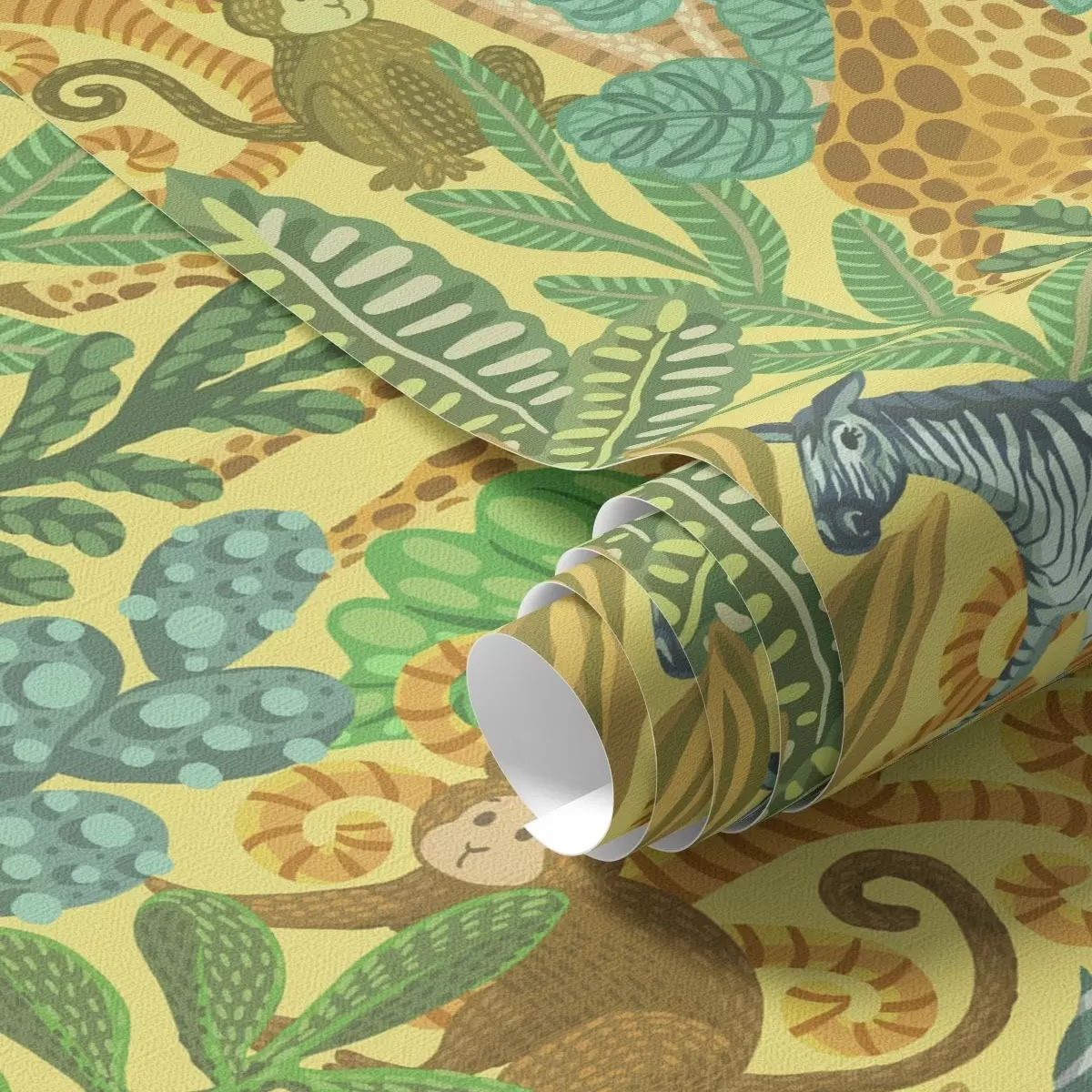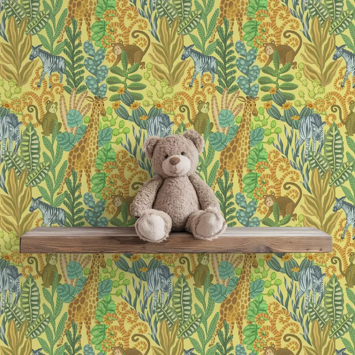 Tapetti Kirahvi, seepra ja apina kirkkaan keltaisella savannilla Nr. a01000v1
