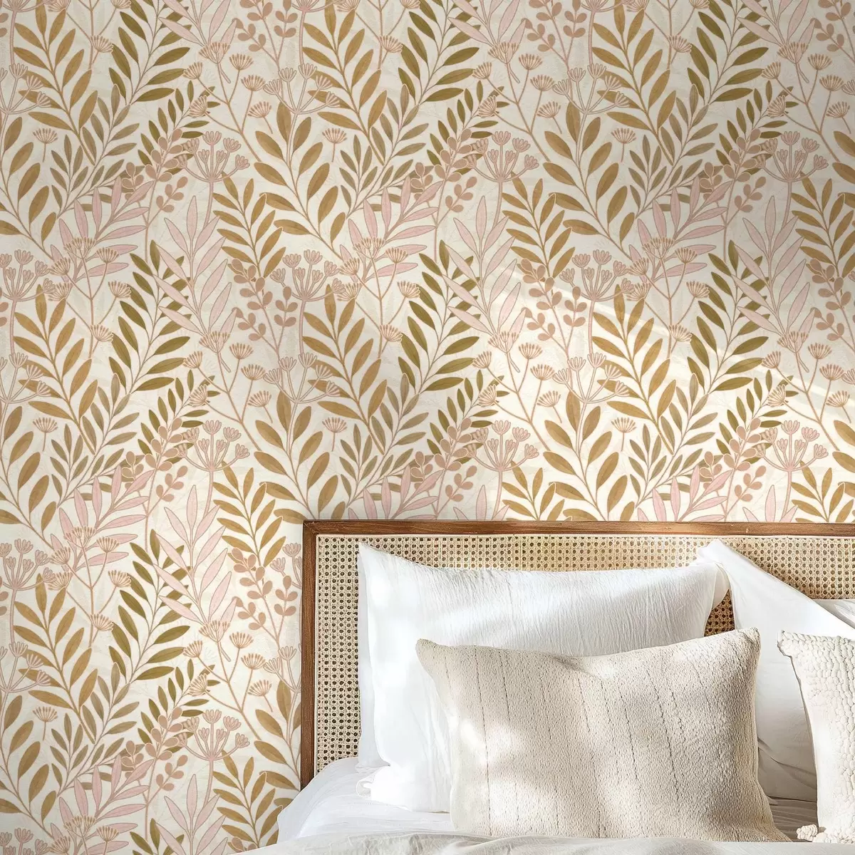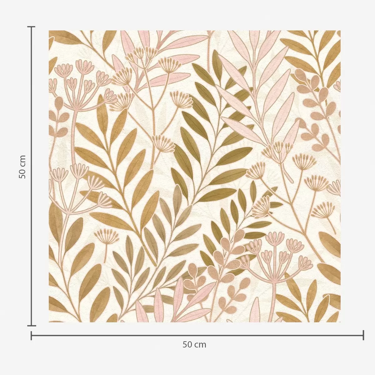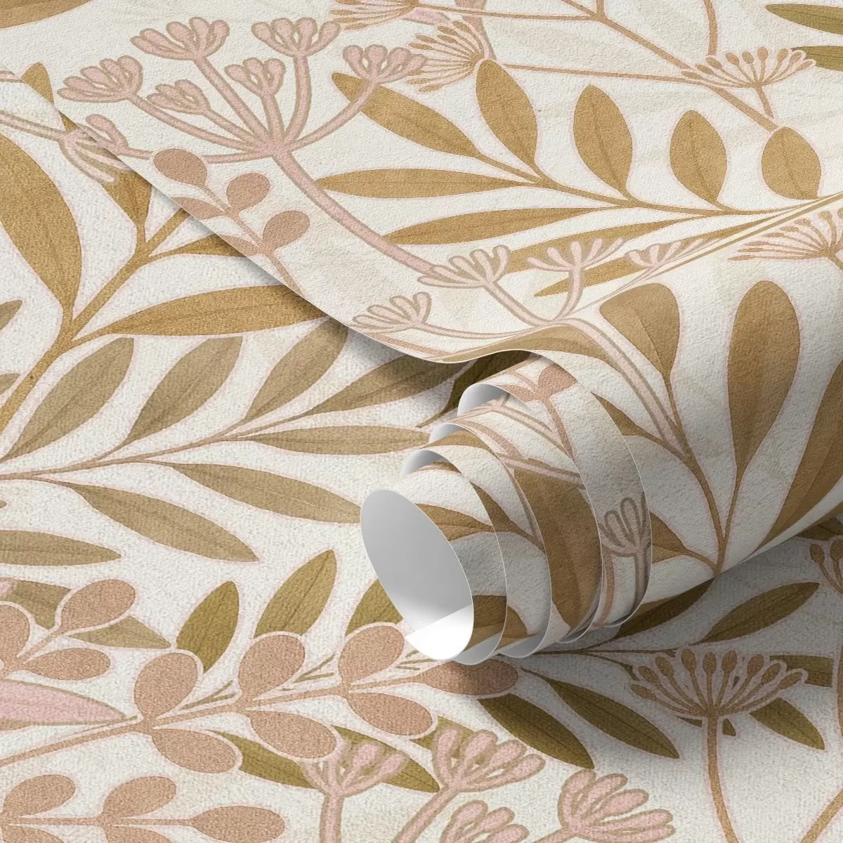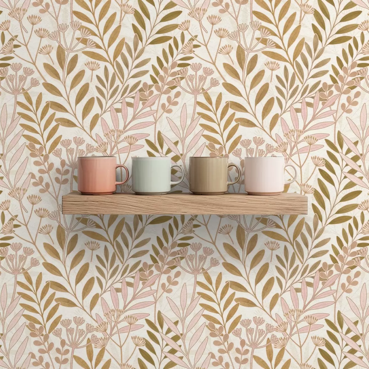 Tapetti Kevyt kasvitunnus, jossa on herkät vaaleanpunaiset ja kaura-sävyiset lehdet Nr. a01020v1