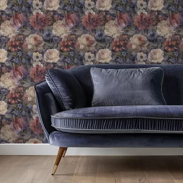 Tapetti Maalauksellinen kukkakimppu suurista kukista syvän indigonvärisellä taustalla Nr. a01021