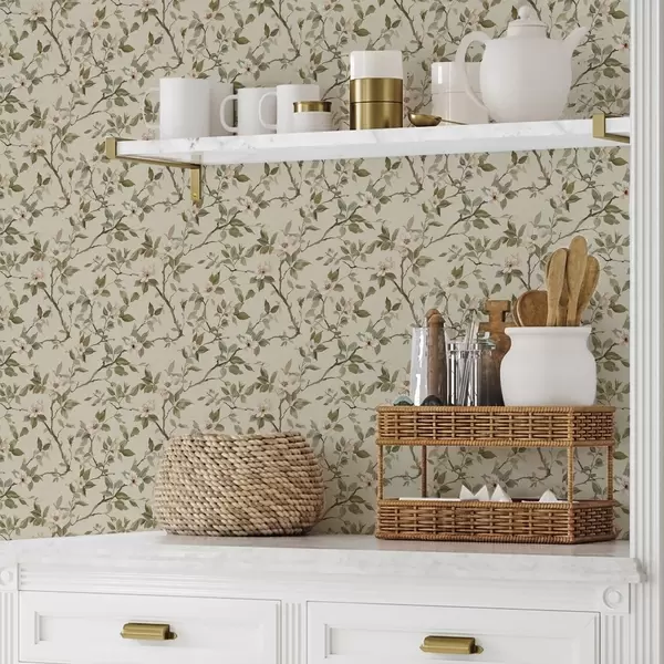 Tapetti Kevyet oksat, joissa on pienet kermanväriset kukat ja vihreät lehdet Nr. a01028
