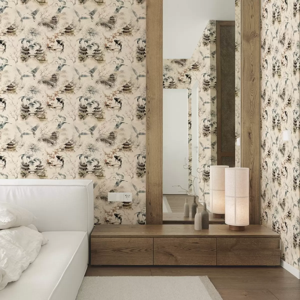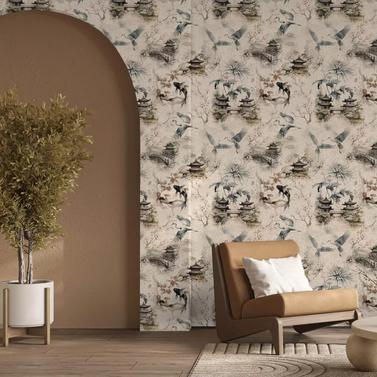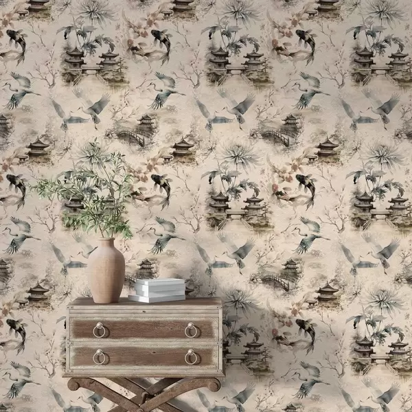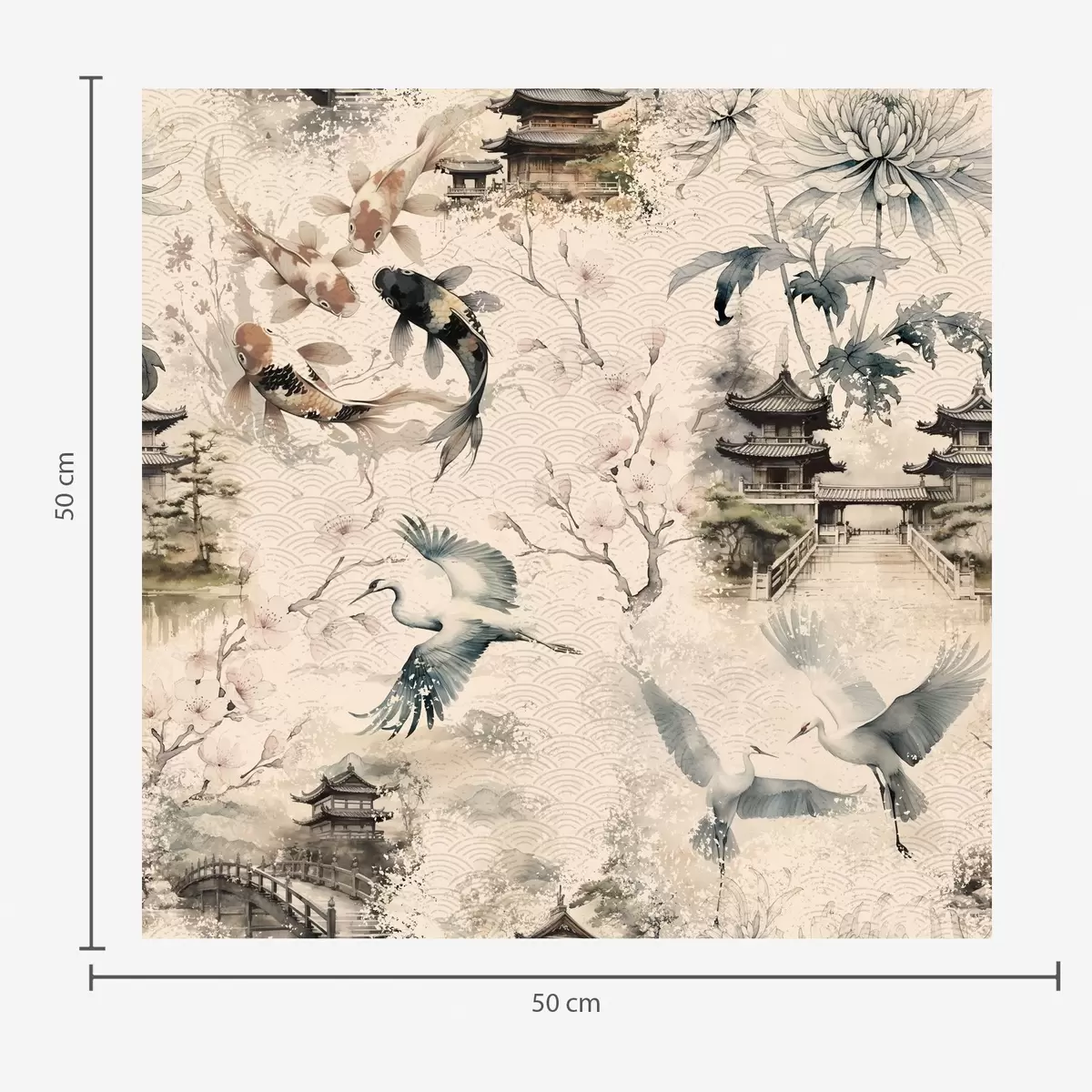 Tapetti Japanilaiset temppelit, koikarpit ja kurjet pehmeällä taustalla Nr. a01040