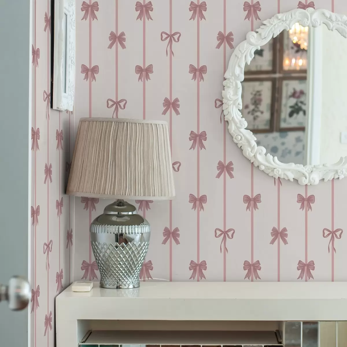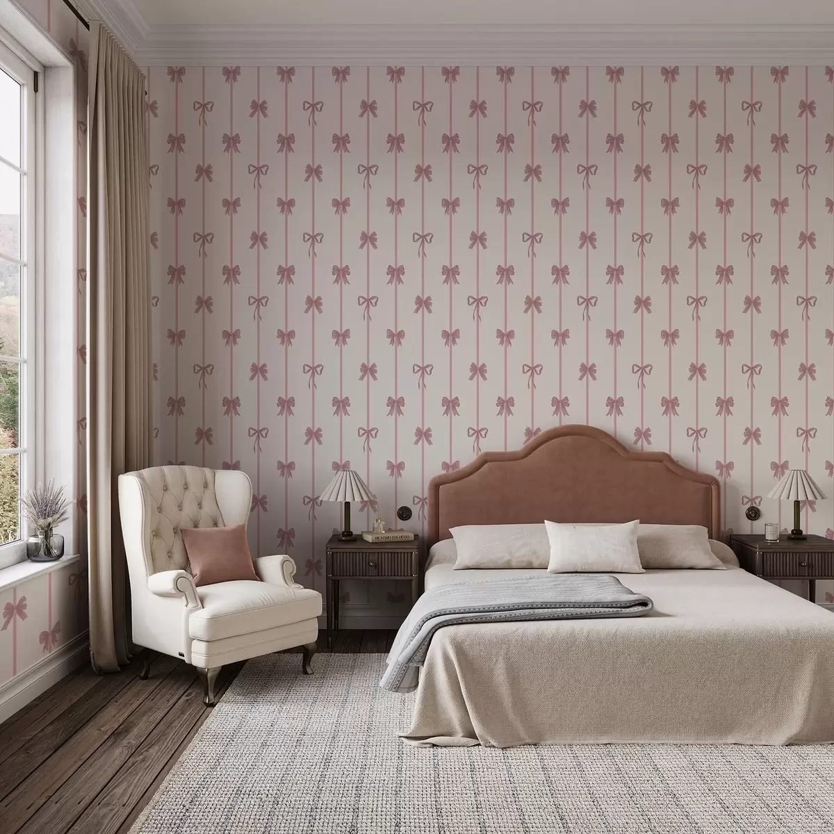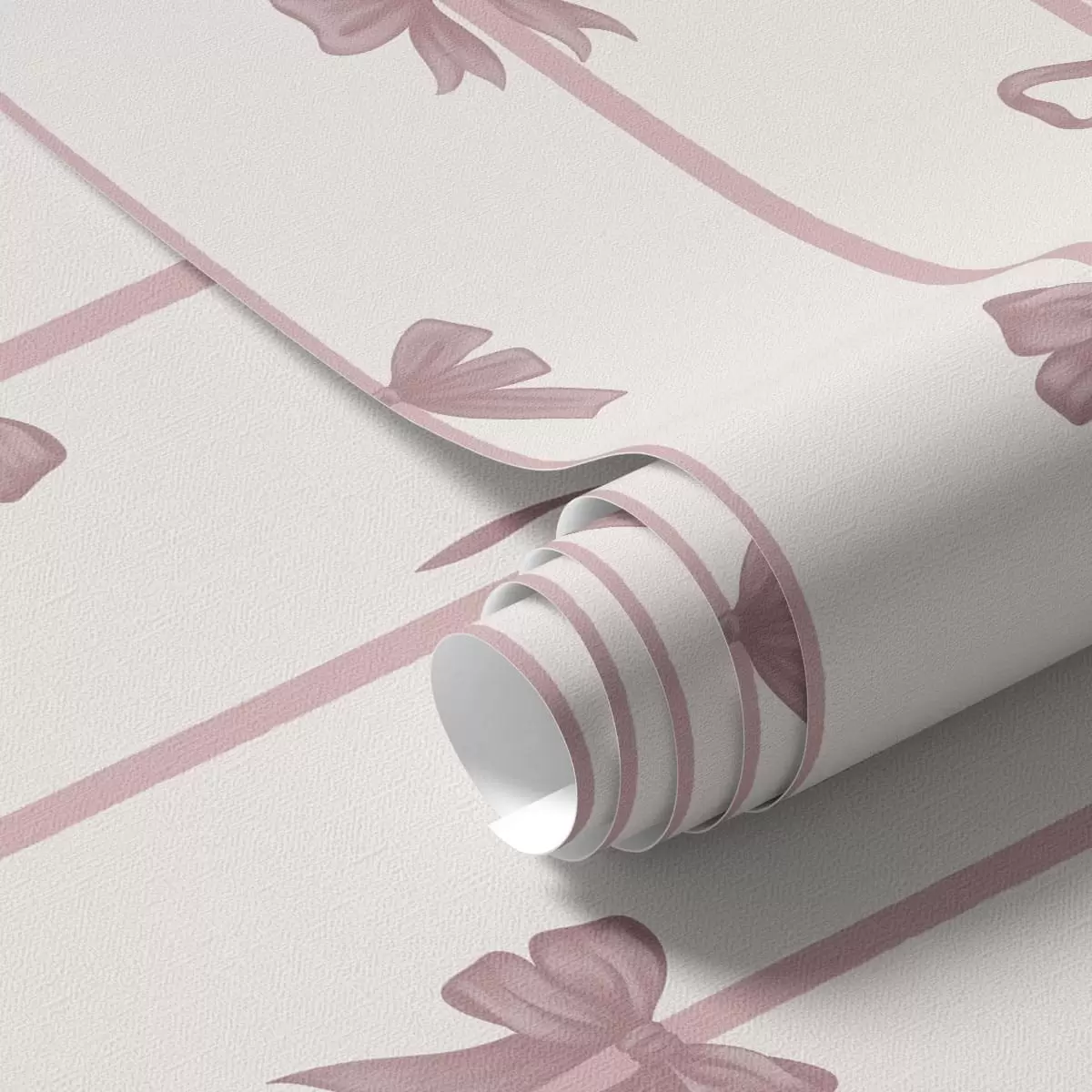 Tapetti Vaalealla taustalla olevat vaaleanpunaiset rusetit nauhoineen Nr. a01074