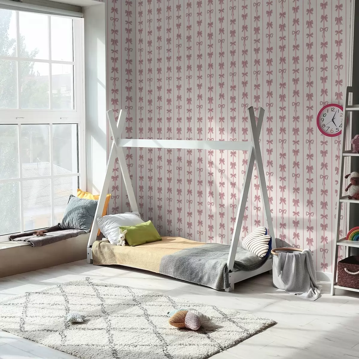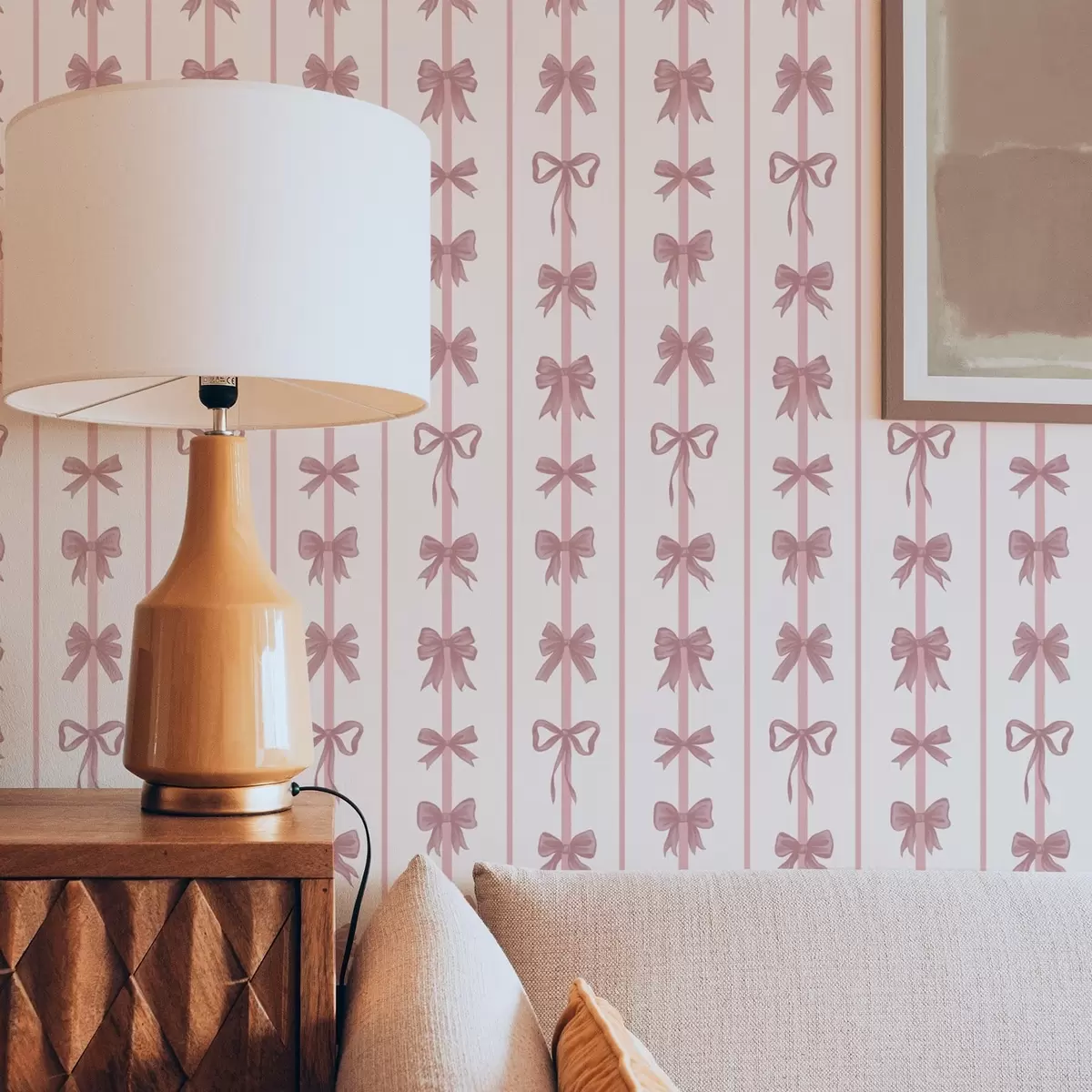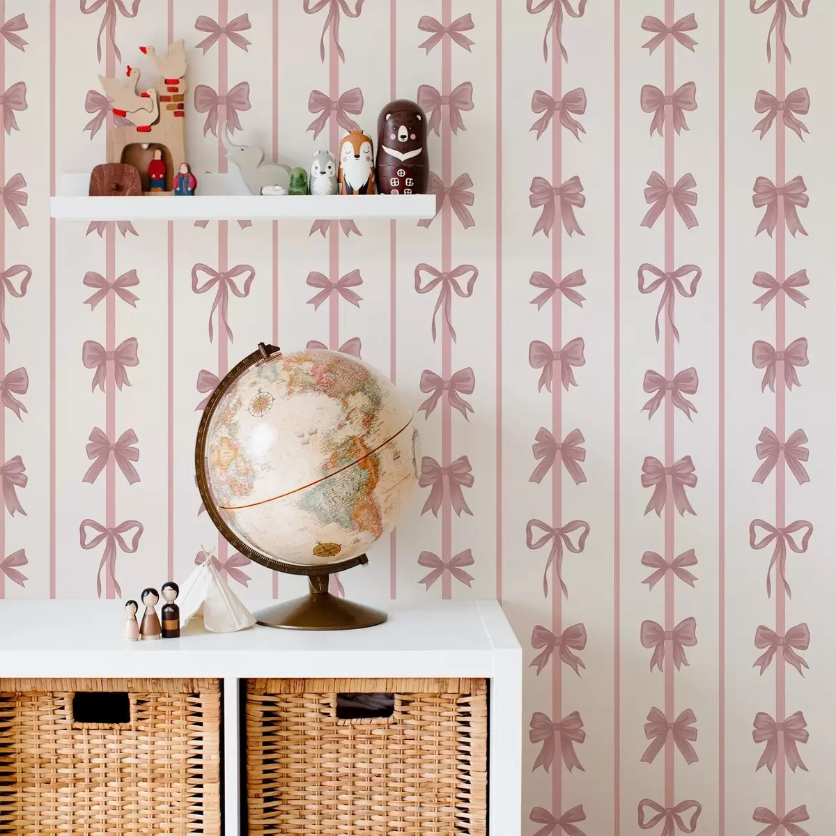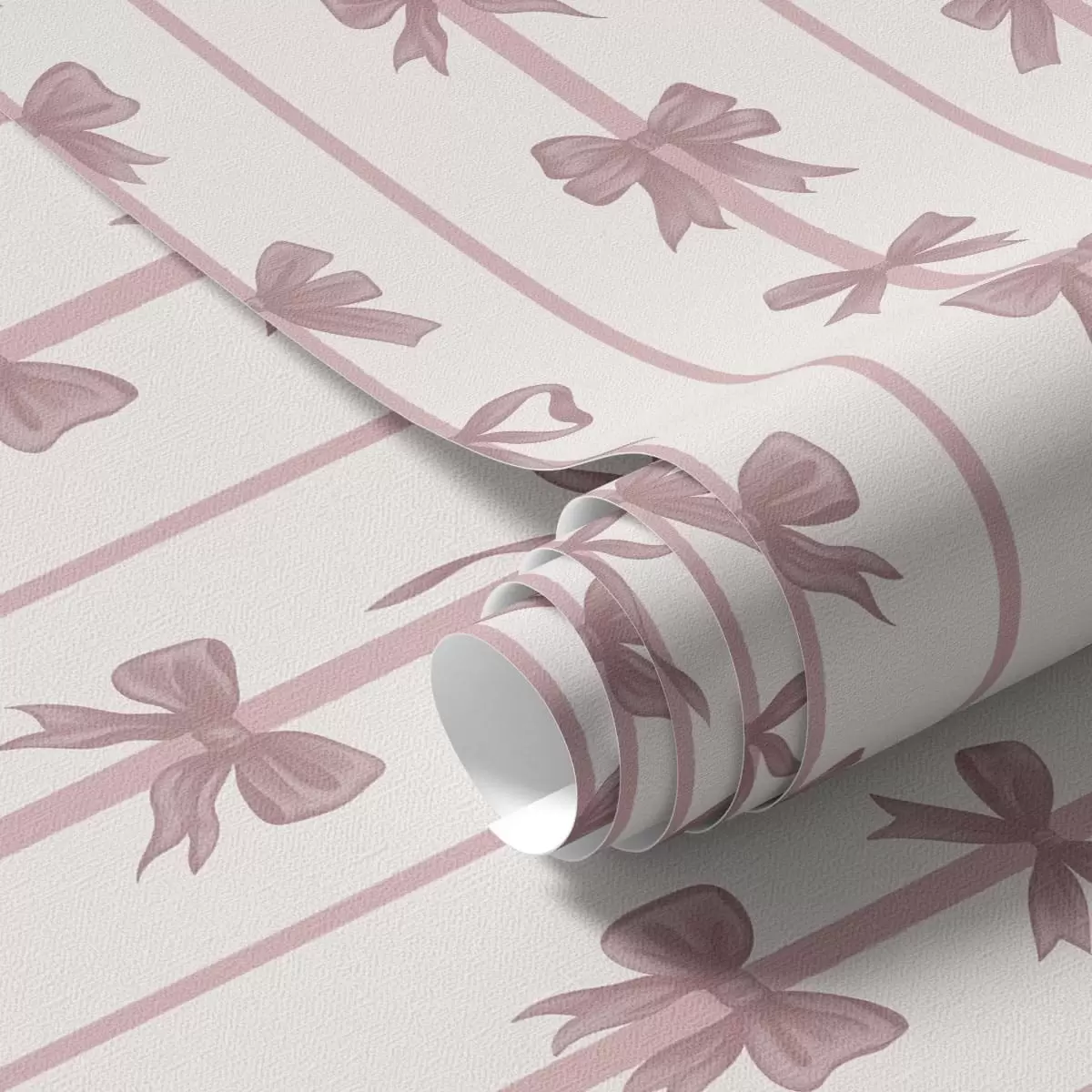 Tapetti Vaalealla taustalla olevat vaaleanpunaiset rusetit pystysuorissa raidoissa Nr. a01075