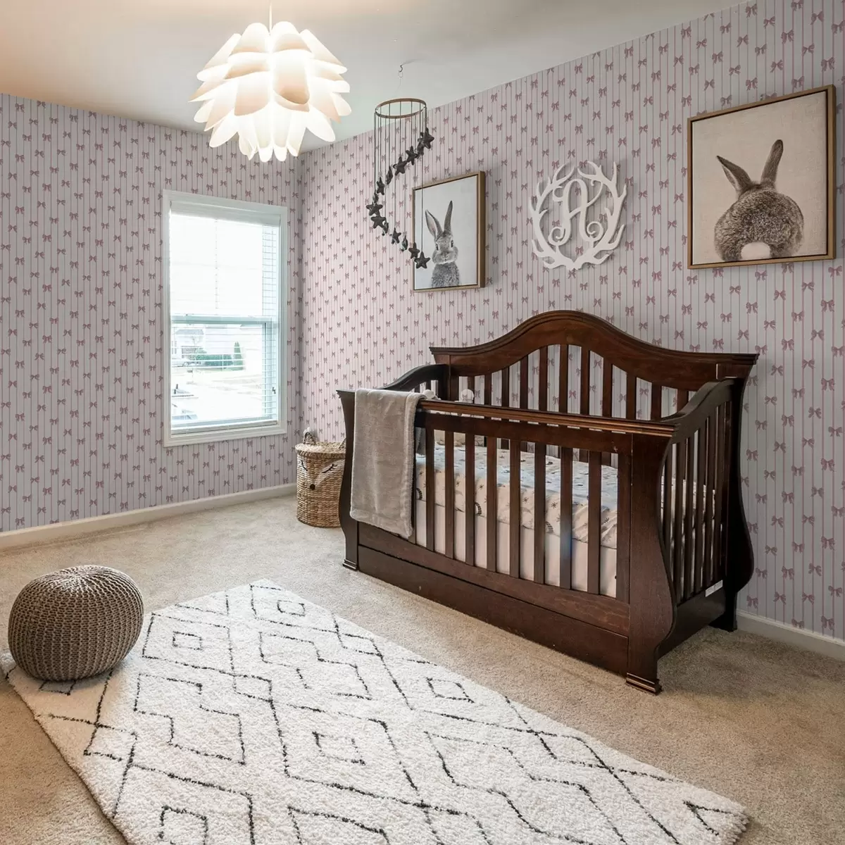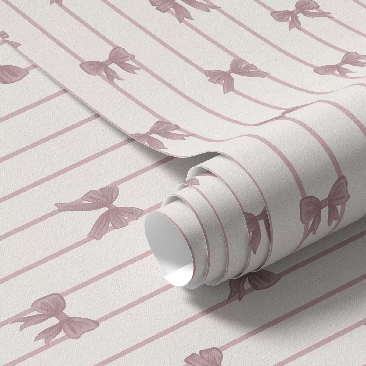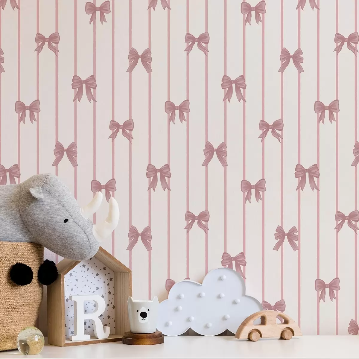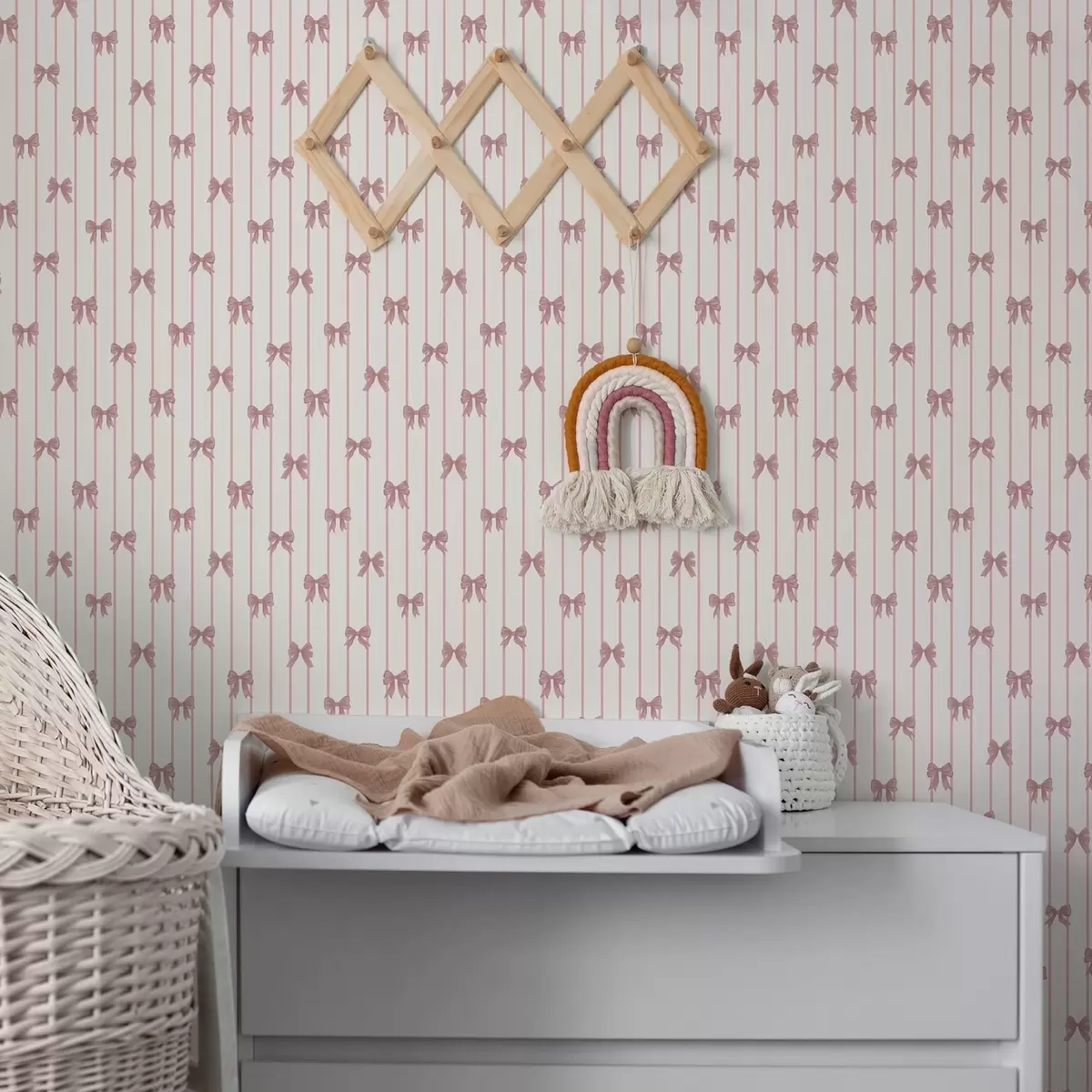 Tapetti Pienet vaaleanpunaiset rusetit pystysuorissa raidoissa Nr. a01076