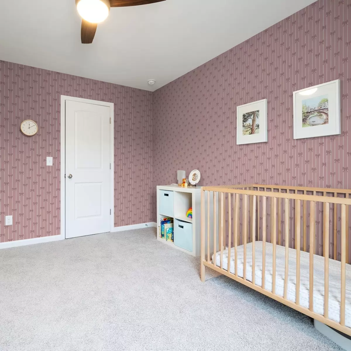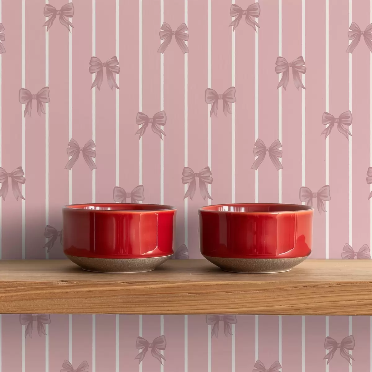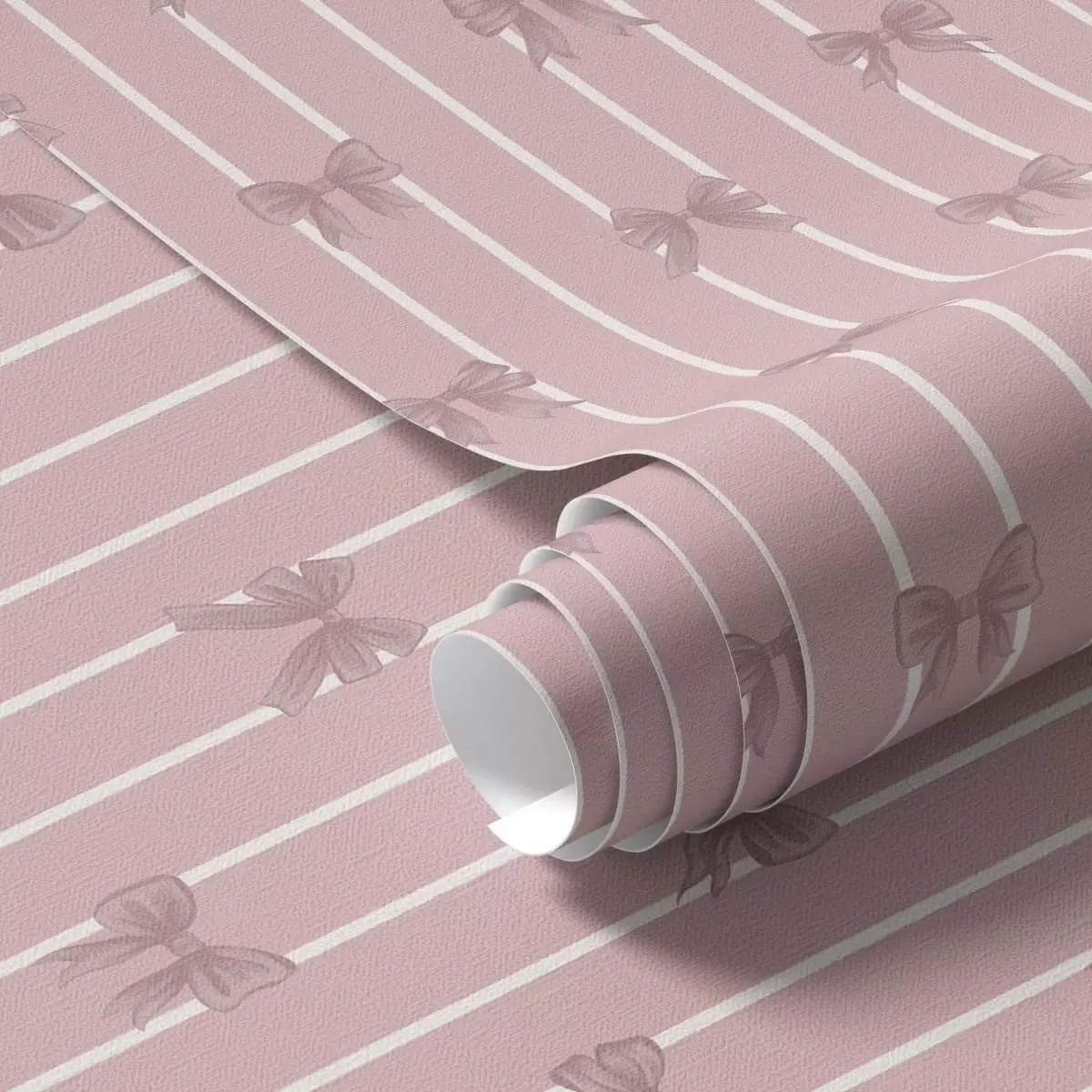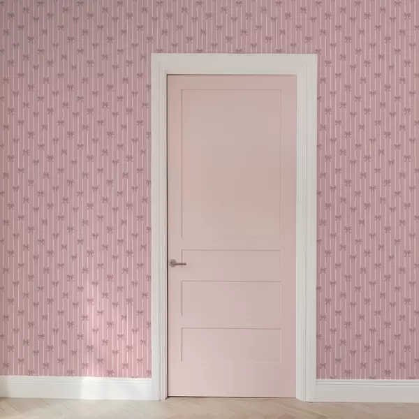 Tapetti Pienet vaaleanpunaiset rusetit vaaleanpunaisella raidallisella taustalla Nr. a01076v1