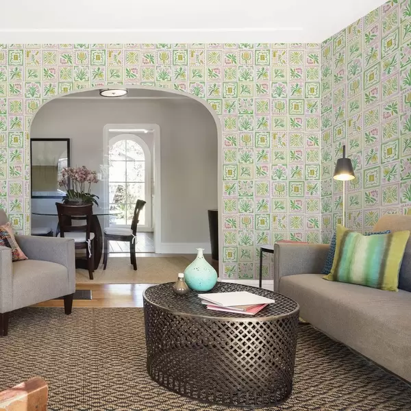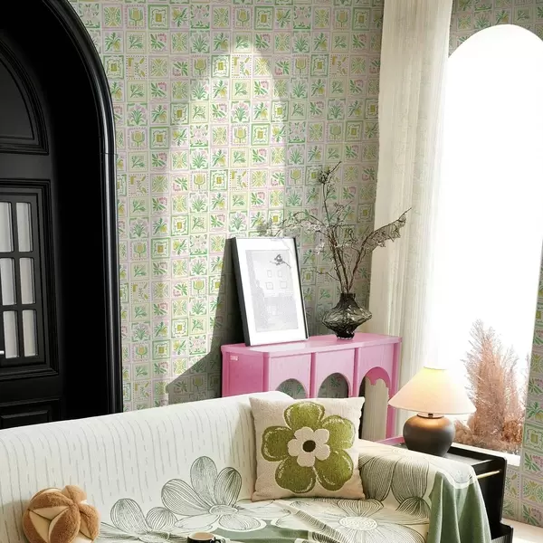 Tapetti Vesiväri-neliöt, joissa on vaaleanpunaisia ja vihreitä oksia Nr. a01082
