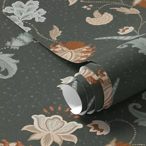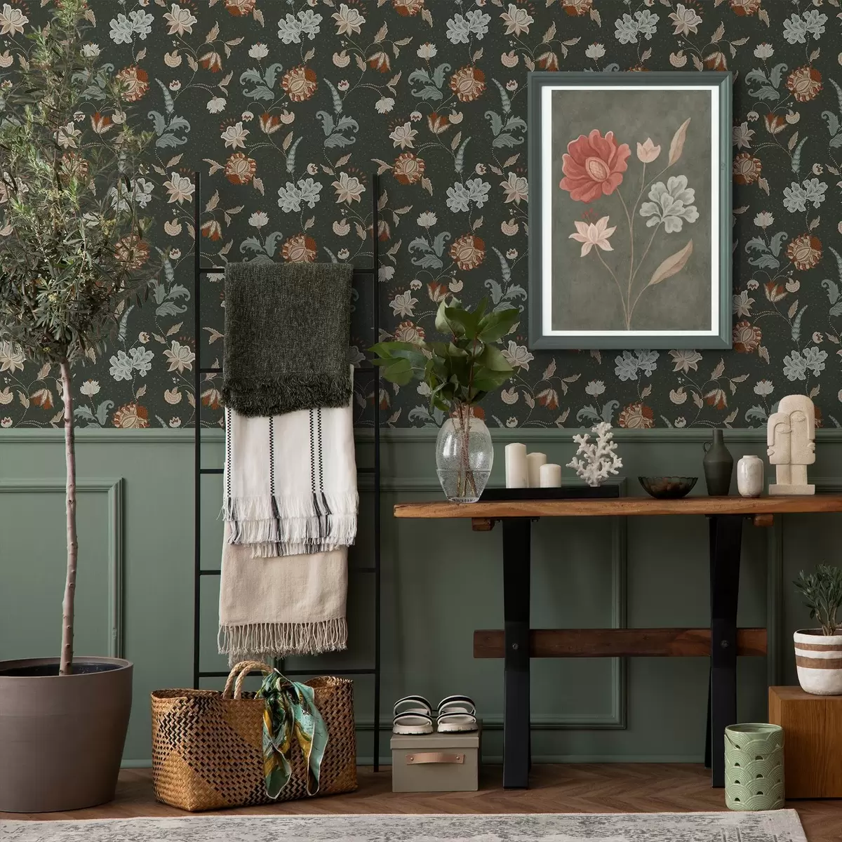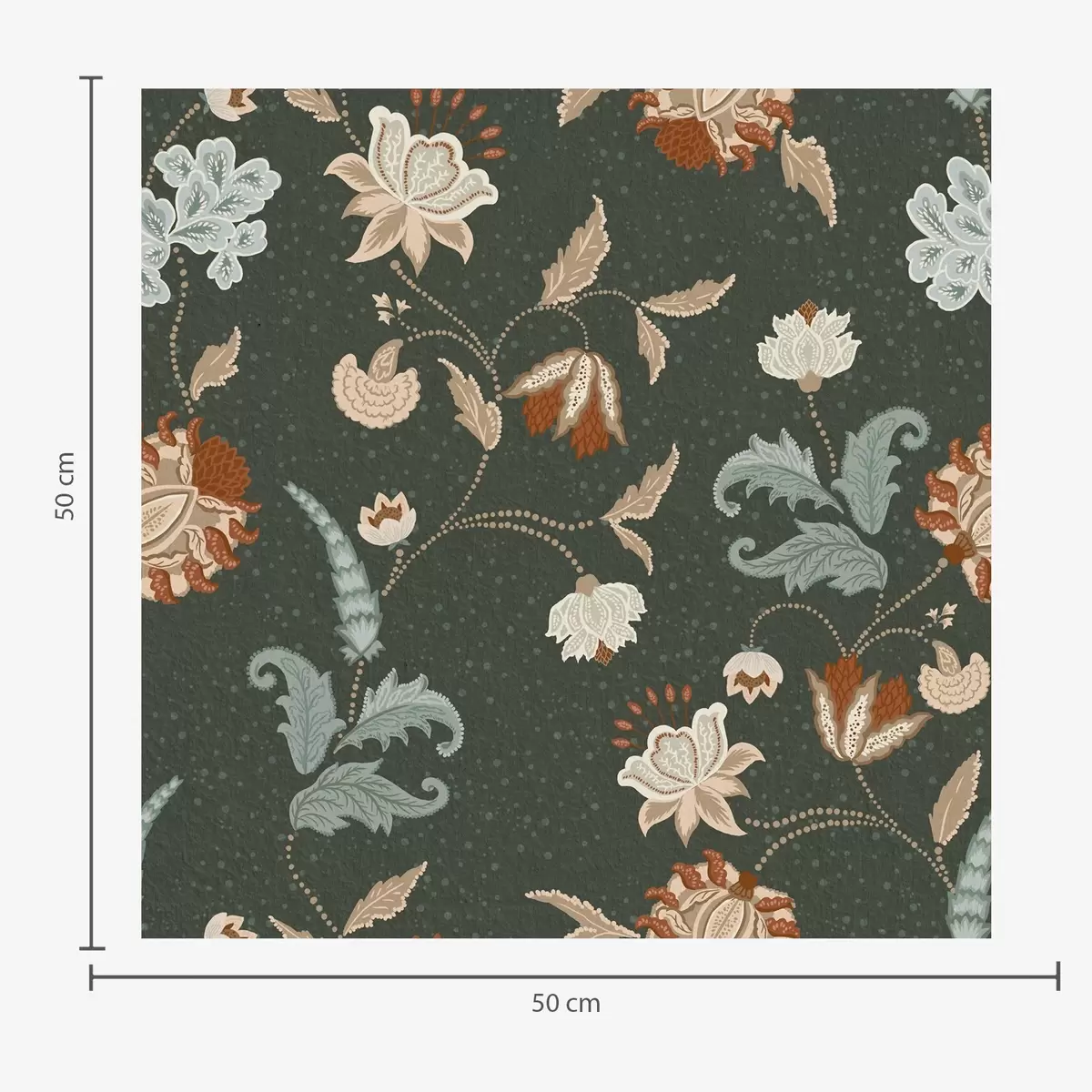 Tapetti Tummanvihreä tausta koristeellisilla kukilla ja lehdillä Nr. a01086
