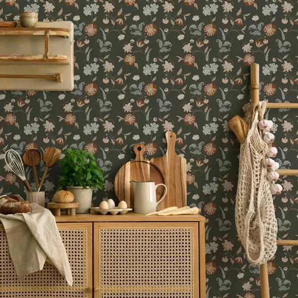Tapetti Tummanvihreä tausta koristeellisilla kukilla ja lehdillä Nr. a01086