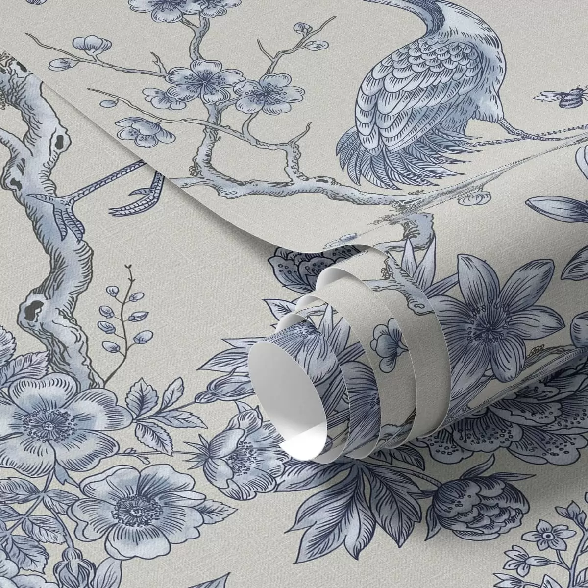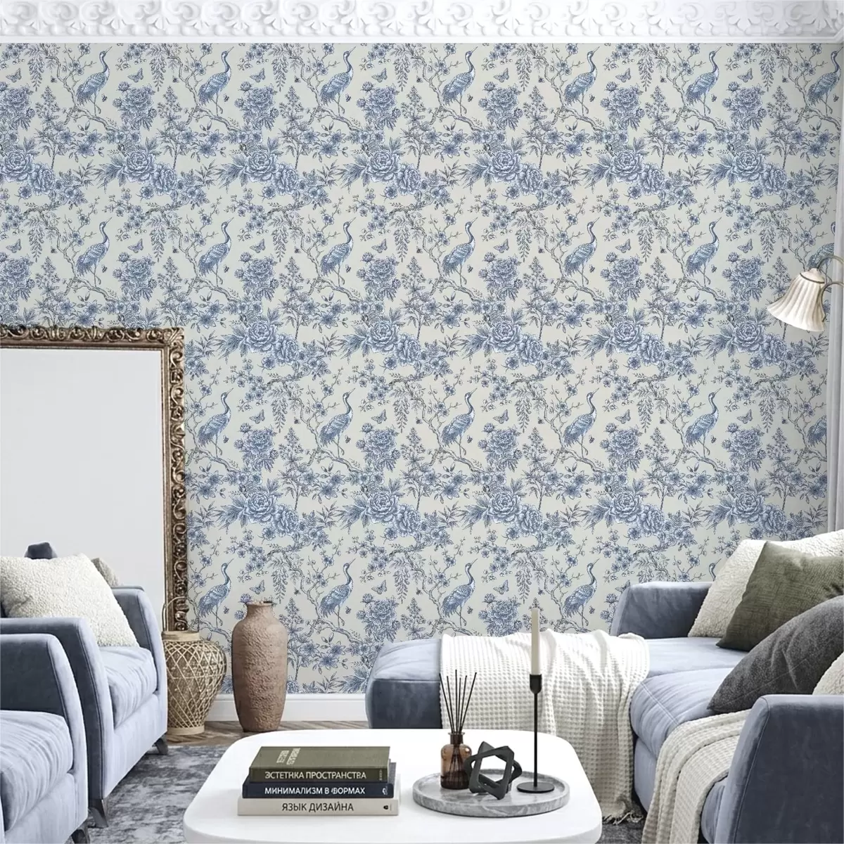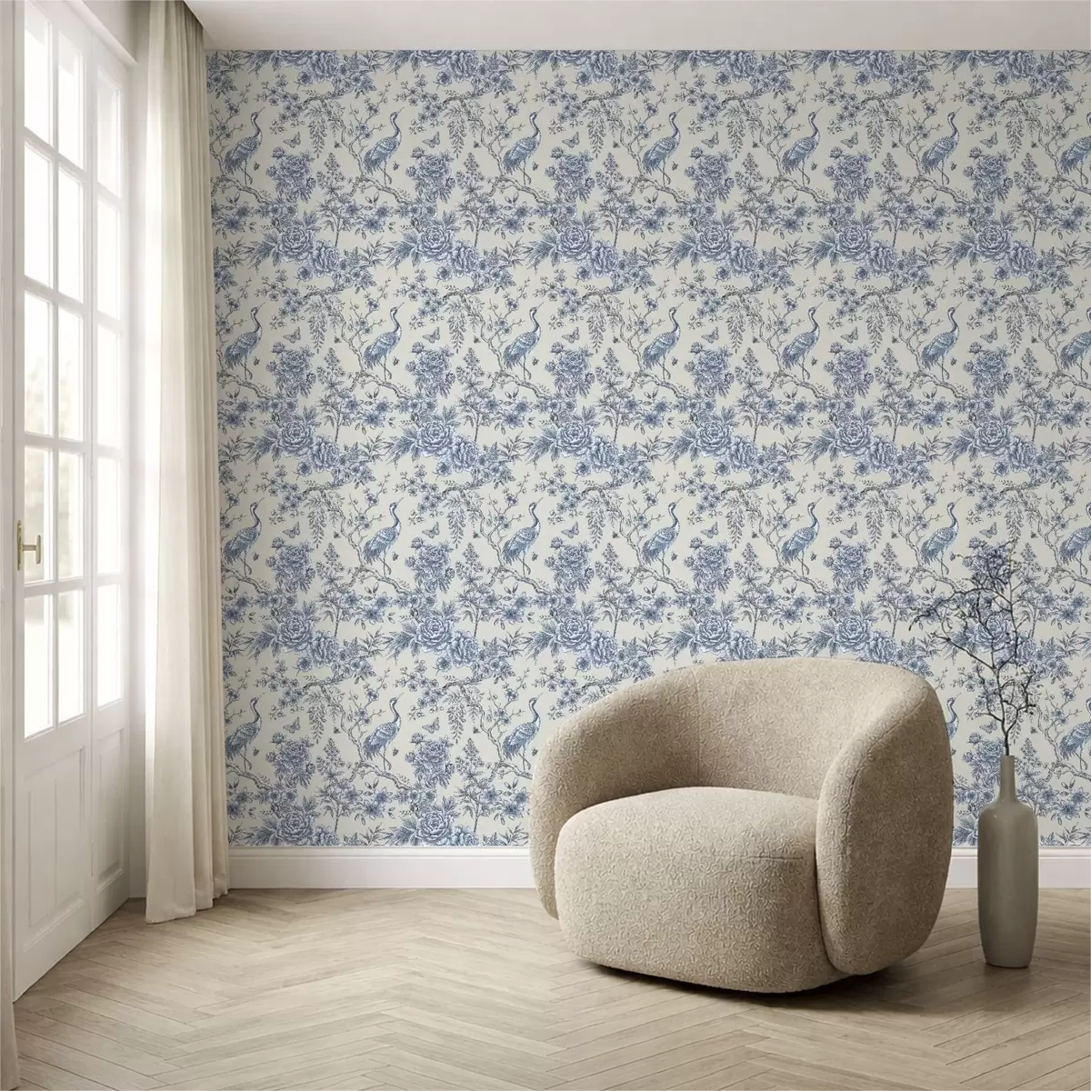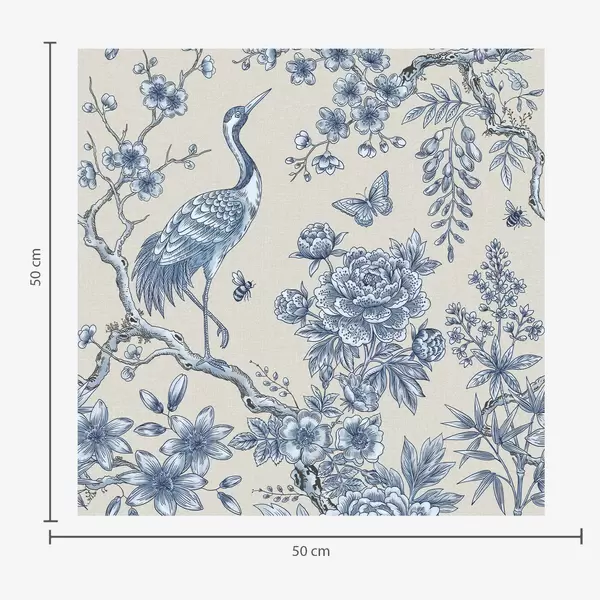 Tapetti Sininen kukkakuvio, jossa on lintu ja oksia Nr. a01132