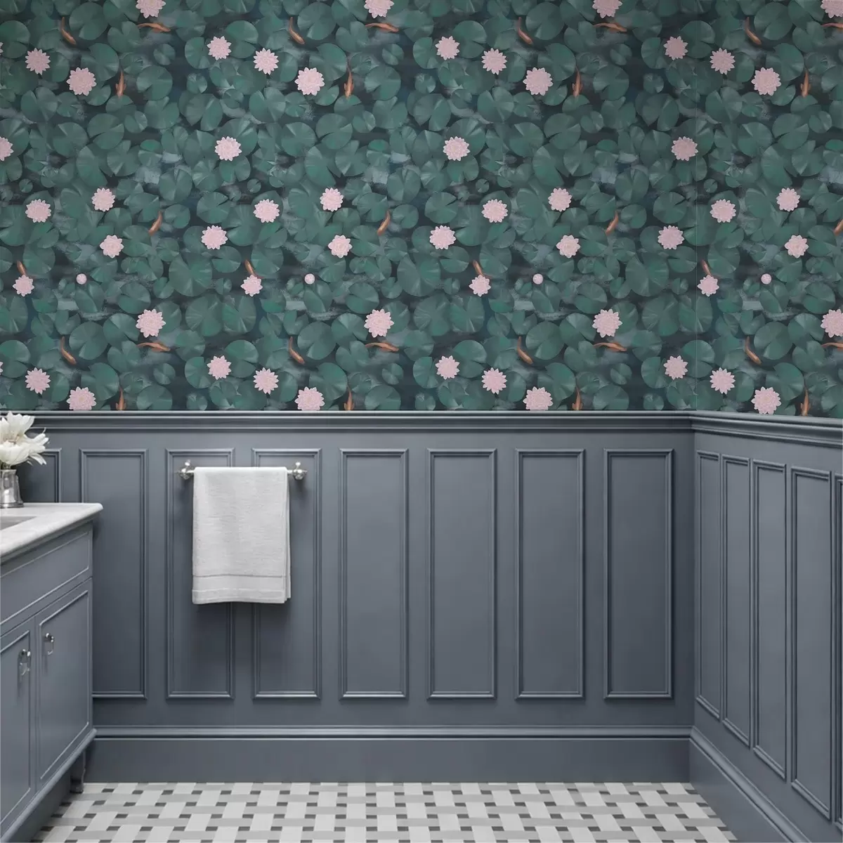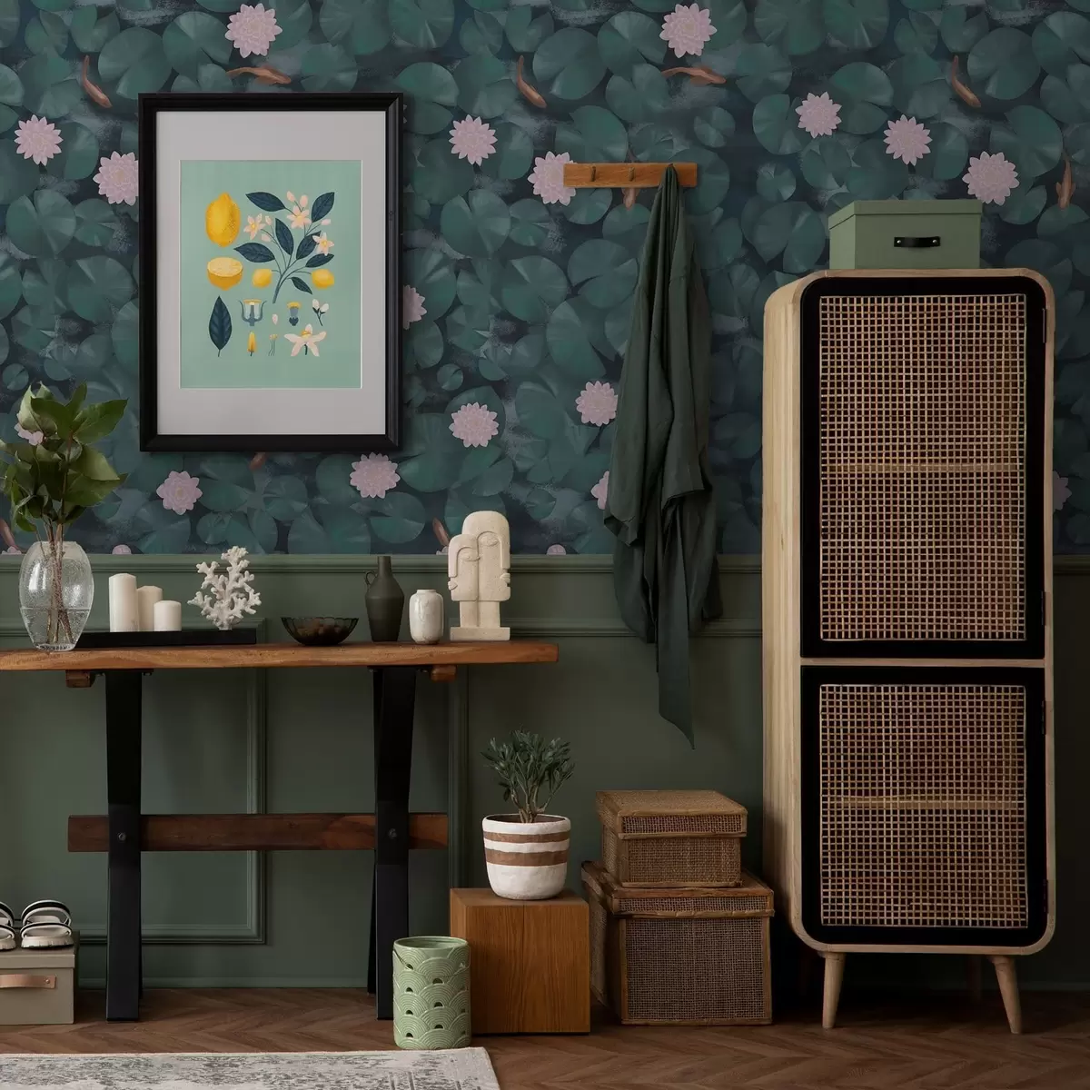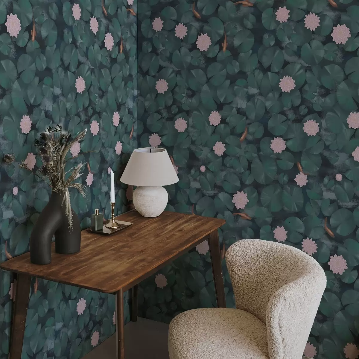 Tapetti Vesililjat, kukkia ja kaloja tummalla taustalla Nr. a01177