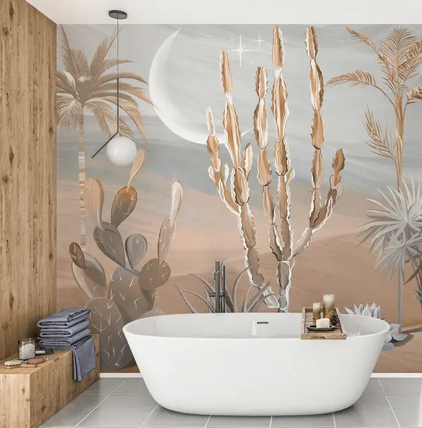Valokuvatapetti 3D-aavikko, jossa kaktuksia ja trooppisia lehtiä Nr u96444
