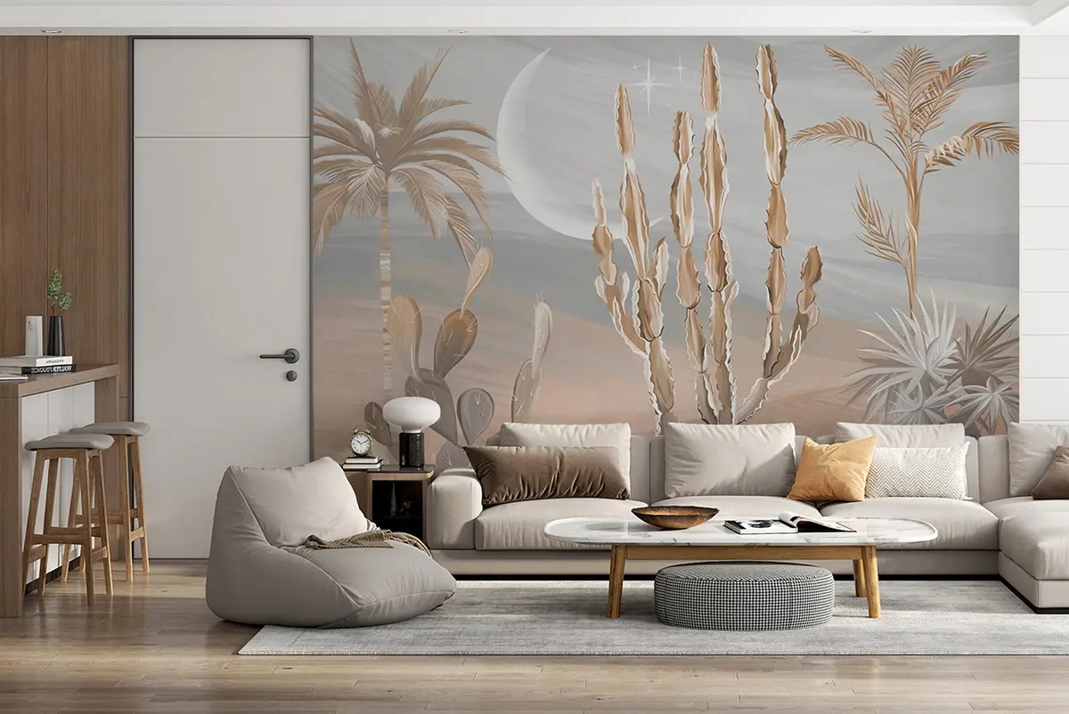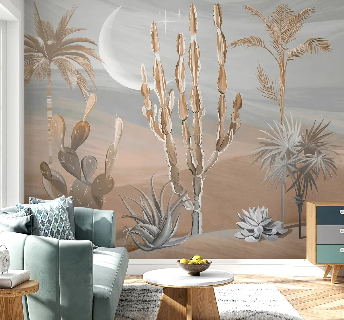 Valokuvatapetti 3D-aavikko, jossa kaktuksia ja trooppisia lehtiä Nr u96444