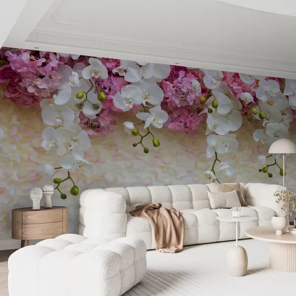 Valokuvatapetti Vaaleanpunaisia ja valkoisia kukkia terälehdillä Nr u57056