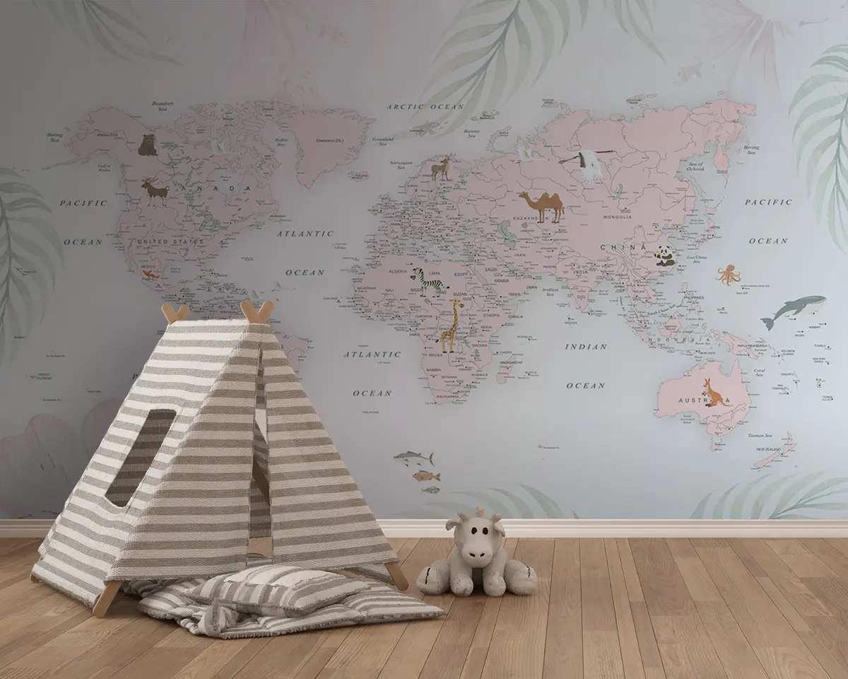 Valokuvatapetti Maailmankartta tytöille vaaleanpunaisessa tyylissä Nr u79832
