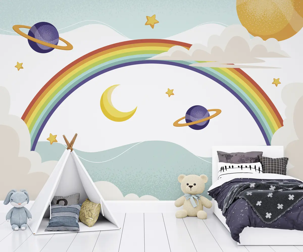 Valokuvatapetti Sateenkaari pilvissä, planeetoissa, tähdissä Nr u94327