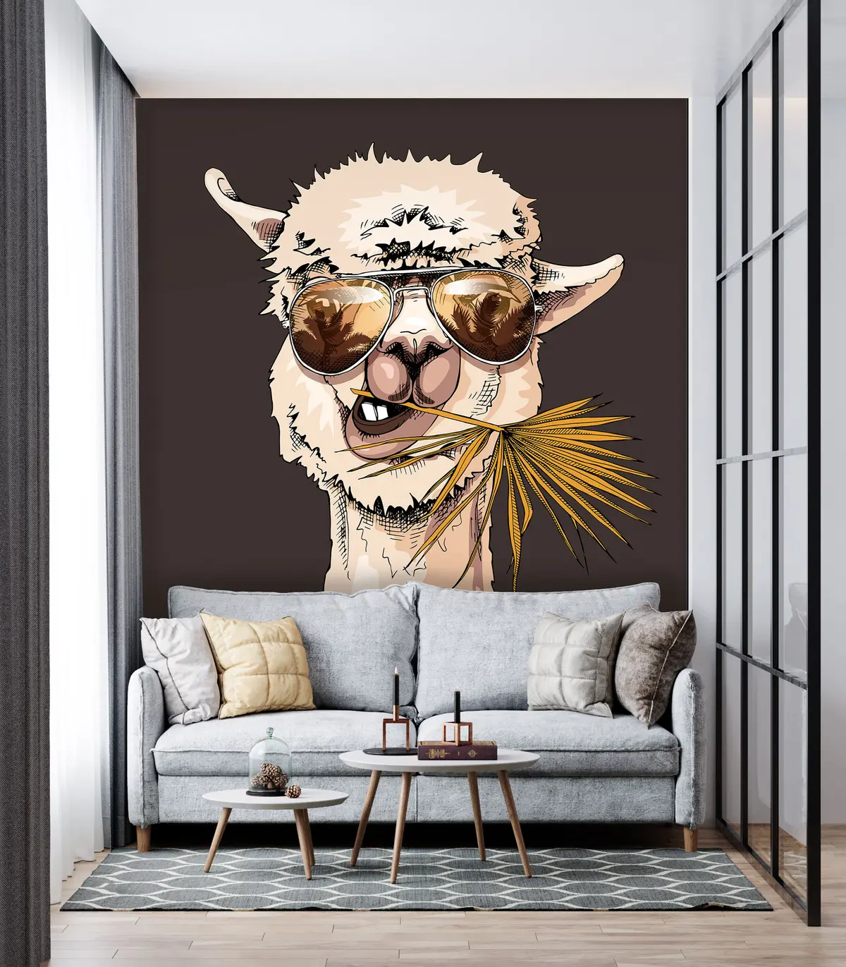 Valokuvatapetti Muotokuva laamasta, jolla on aurinkolasit ja viuhkainen palmunlehti Nr u98177v2