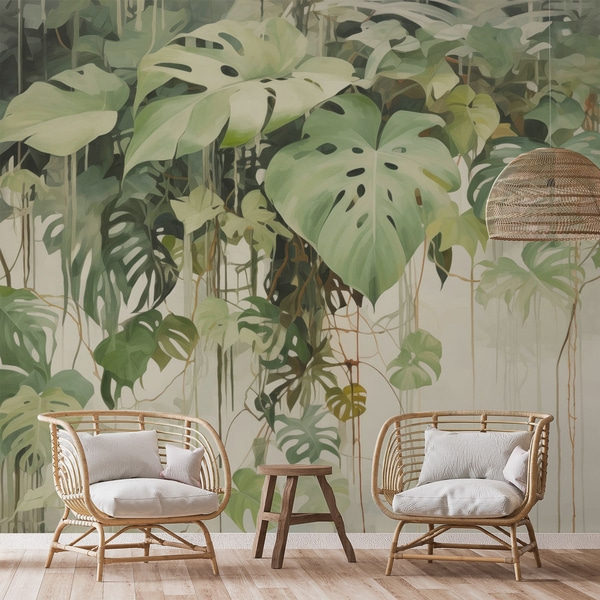 Monstera ja palmunlehdet vihreän ja harmaan sävyissä, kasvitieteellinen, trooppiset lehdet, viidakkokasvit, kuvioitu tausta