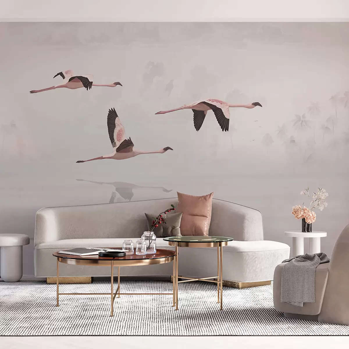 Valokuvatapetti Vaaleanpunaiset flamingot trooppisen viidakon rannan ja meren yläpuolella Nr u97457