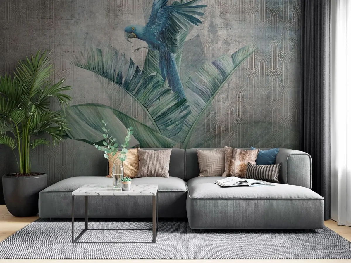 Valokuvatapetti Iso sininen papukaija banaanipuulla grunge-betonitekstuurilla Nr u95432