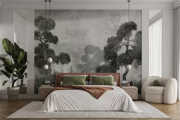 Valokuvatapetti Trooppisia puita ja lehtiä sumuisessa metsässä Nr u95901