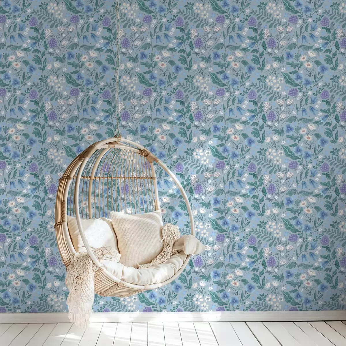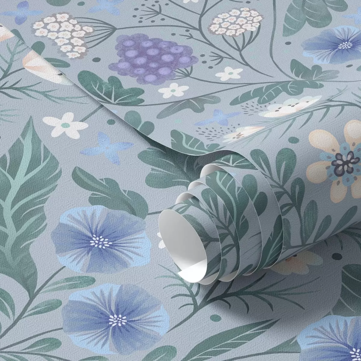 Tapetti Kukkaset ja marjat harmaansinisellä taustalla Nr. a00849v1