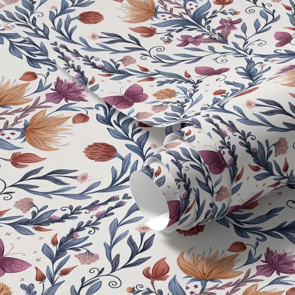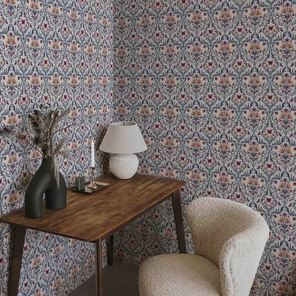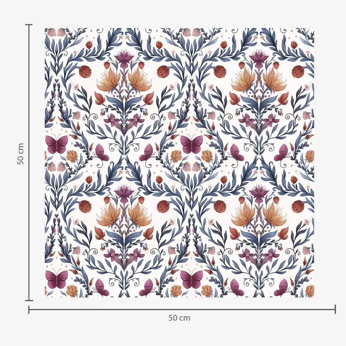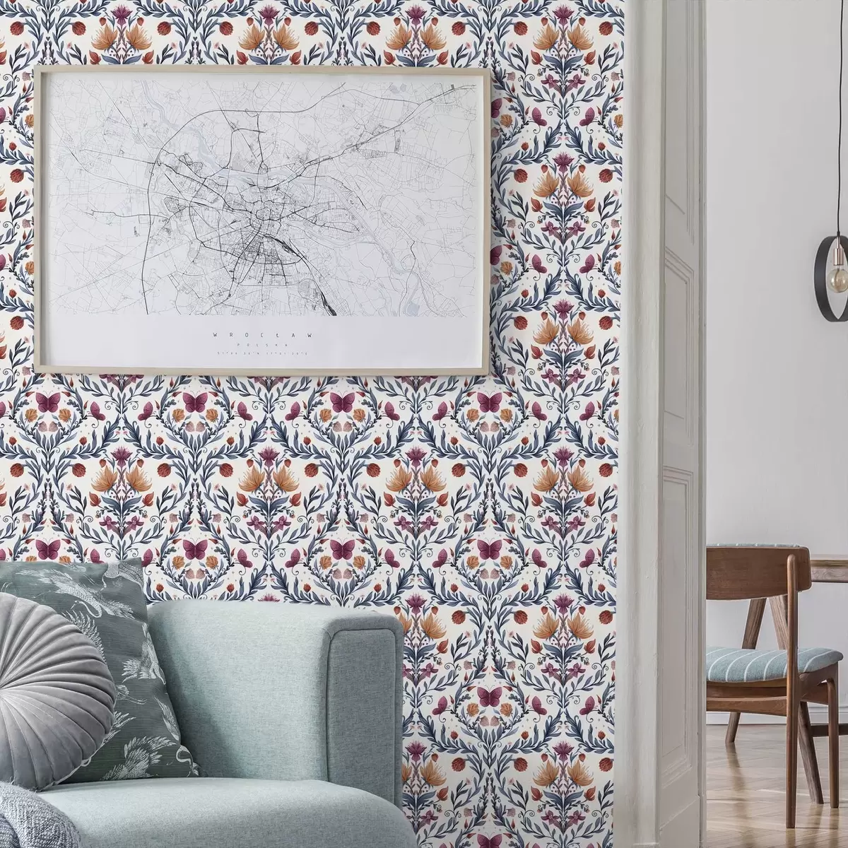 Tapetti Kukkainen damaskikuvio ja perhoset lämpimällä kermanvärisellä pohjalla Nr. a00926v2