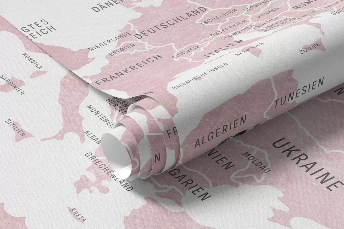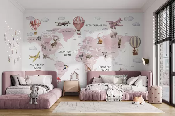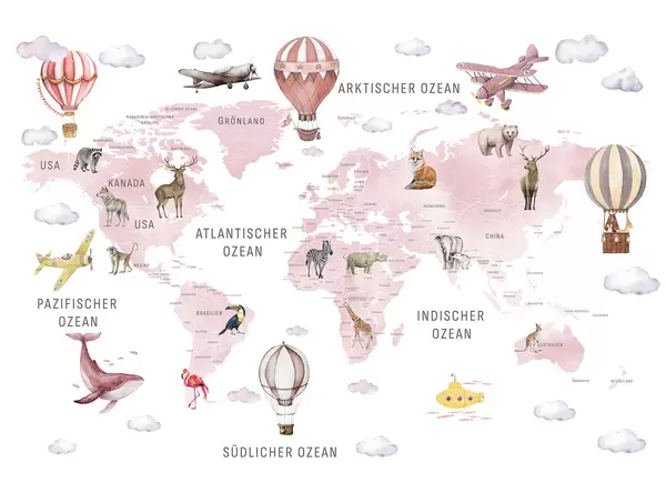 Valokuvatapetti Lasten kartta vesiväri-tyylillä, jossa on eläimiä ja kuumailmapalloja. Saksankielinen. Vaaleanpunainen. Nr c00001dev3