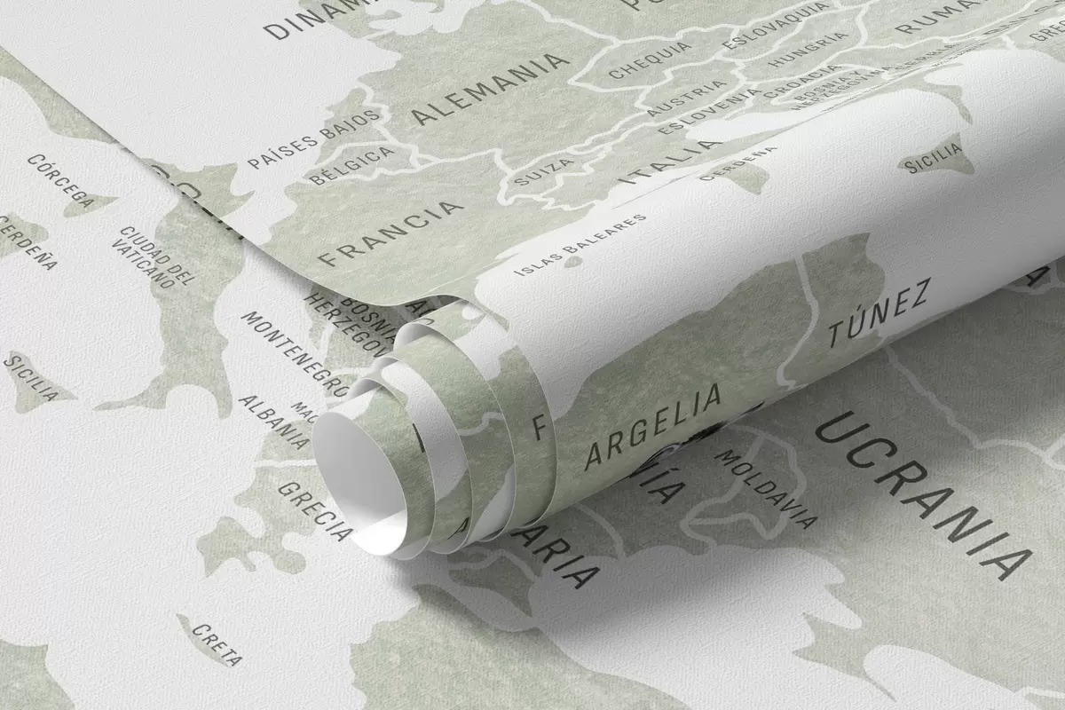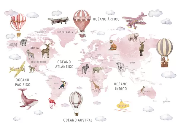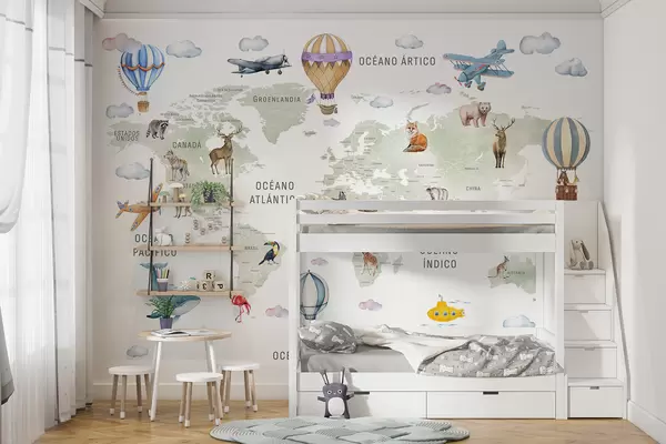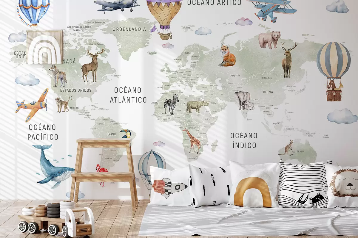 Valokuvatapetti Lasten kartta vesiväri-tyylillä, jossa on eläimiä ja kuumailmapalloja. Espanjan kielellä. Vihreä väri. Nr c00001es