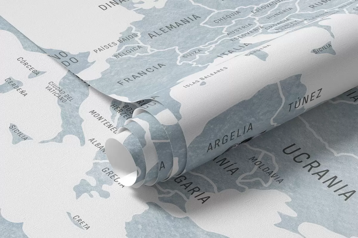 Valokuvatapetti Lasten kartta vesiväri-tyylillä, jossa on eläimiä ja kuumailmapalloja. Espanjaksi. Sininen väri. Nr c00001esv1