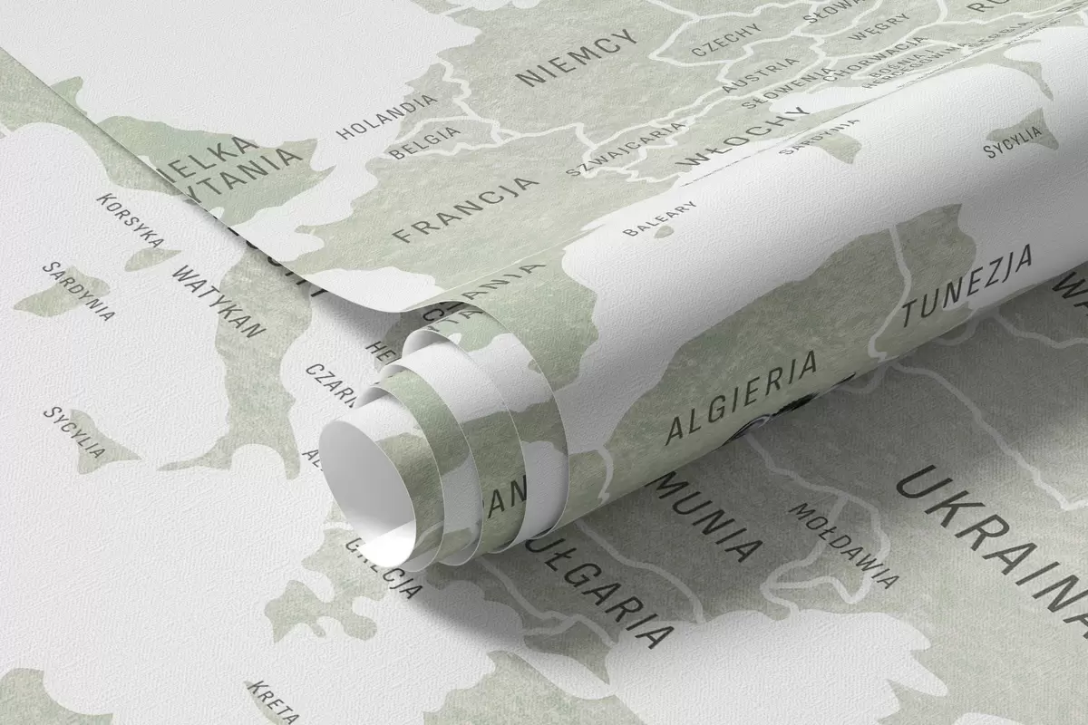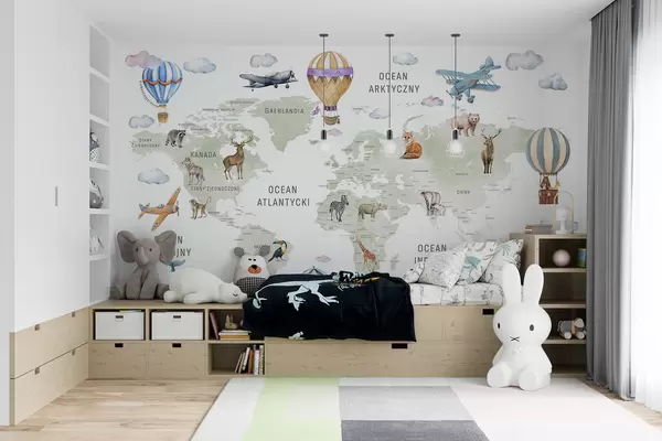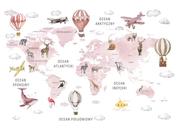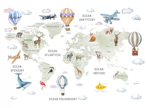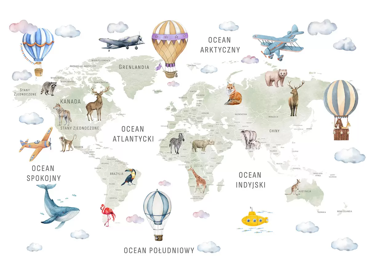 Valokuvatapetti Lasten kartta vesiväri-tyylillä, jossa on eläimiä ja kuumailmapalloja. Puolan kielellä. Vihreä väri. Nr c00001pl