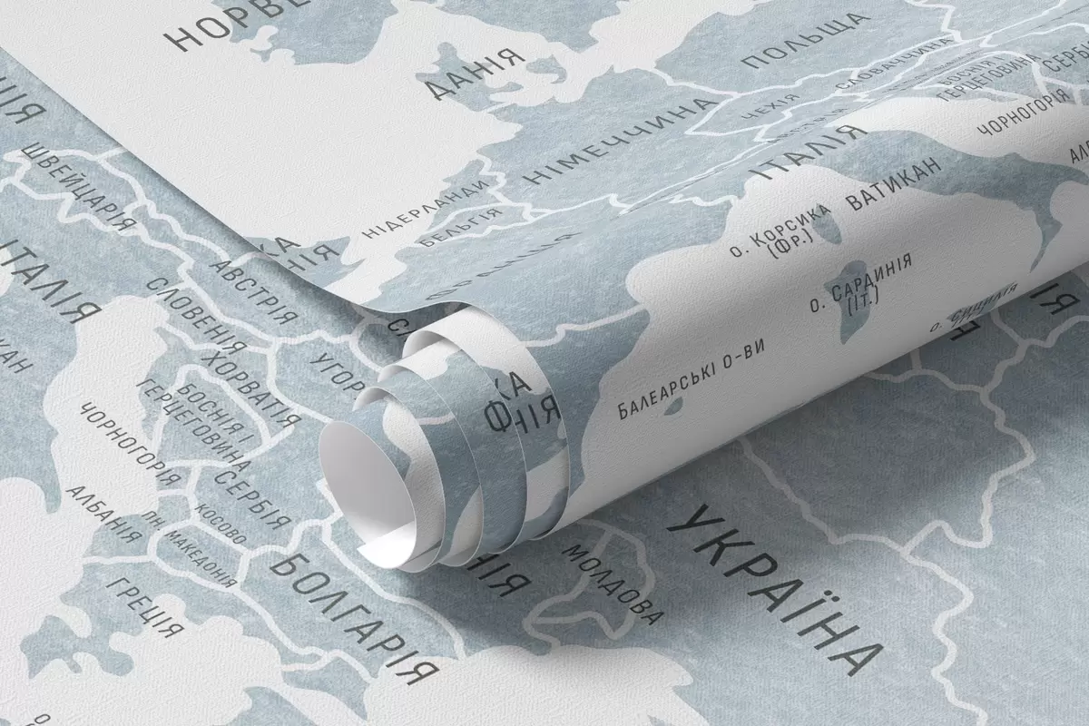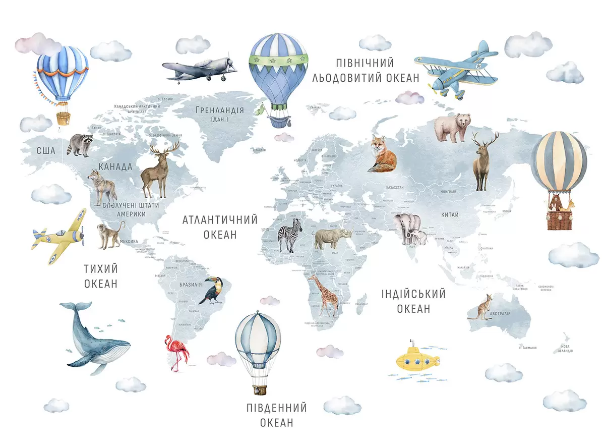 Valokuvatapetti Lasten kartta vesiväri-tyylillä, jossa on eläimiä ja kuumailmapalloja. Ukrainan kielellä. Sininen väri. Nr c00001ukv1