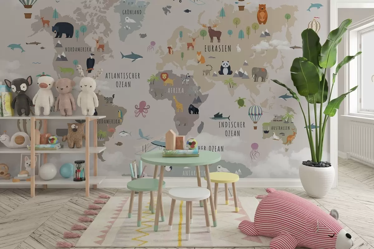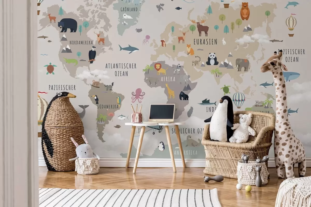 Valokuvatapetti Lasten maailmankartta, jossa on eläimiä ja kuumailmapalloja. Saksan kieli Nr c00002de