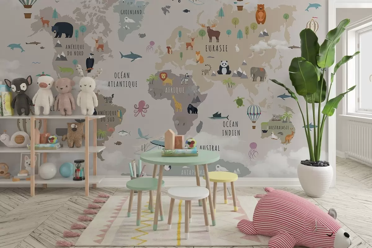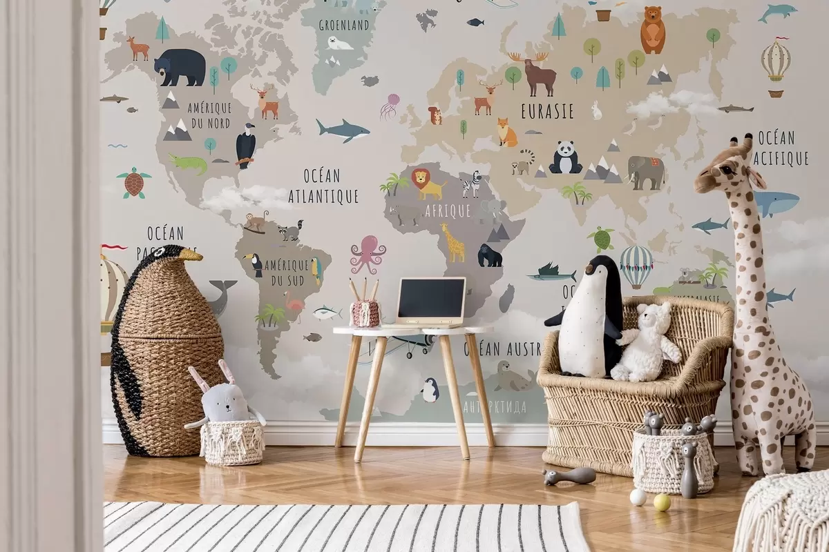 Valokuvatapetti Lasten maailmankartta, jossa on eläimiä ja kuumailmapalloja. Ranskan kieli Nr c00002fr