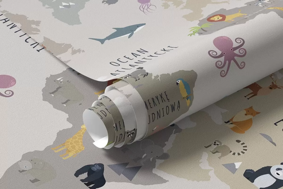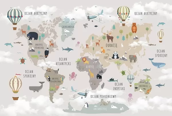 Valokuvatapetti Lasten maailmankartta, jossa on eläimiä ja kuumailmapalloja. Puolan kieli Nr c00002pl