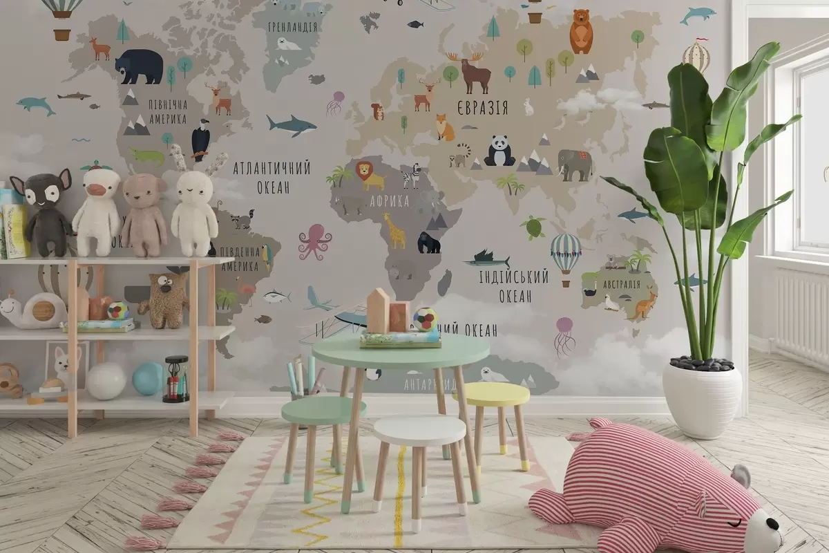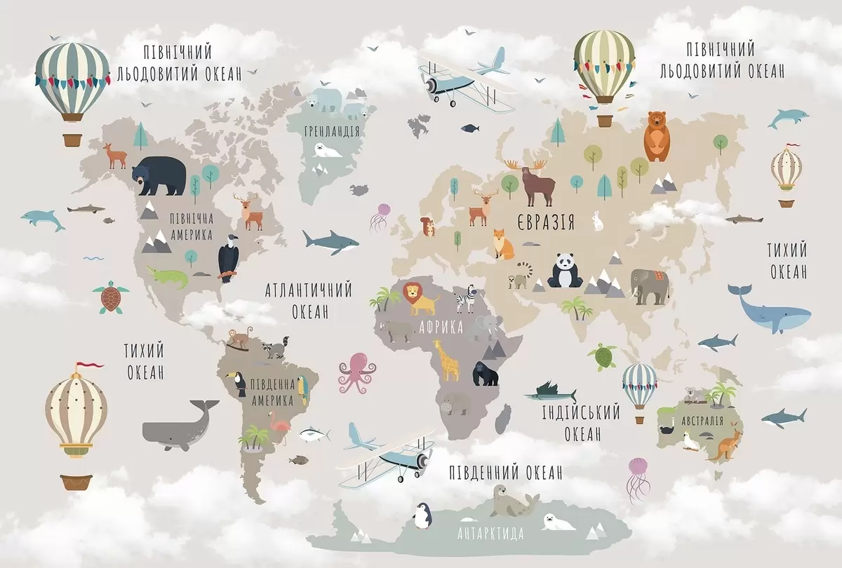 Valokuvatapetti Lasten maailmankartta, jossa on eläimiä ja kuumailmapalloja. Ukrainan kieli Nr c00002uk