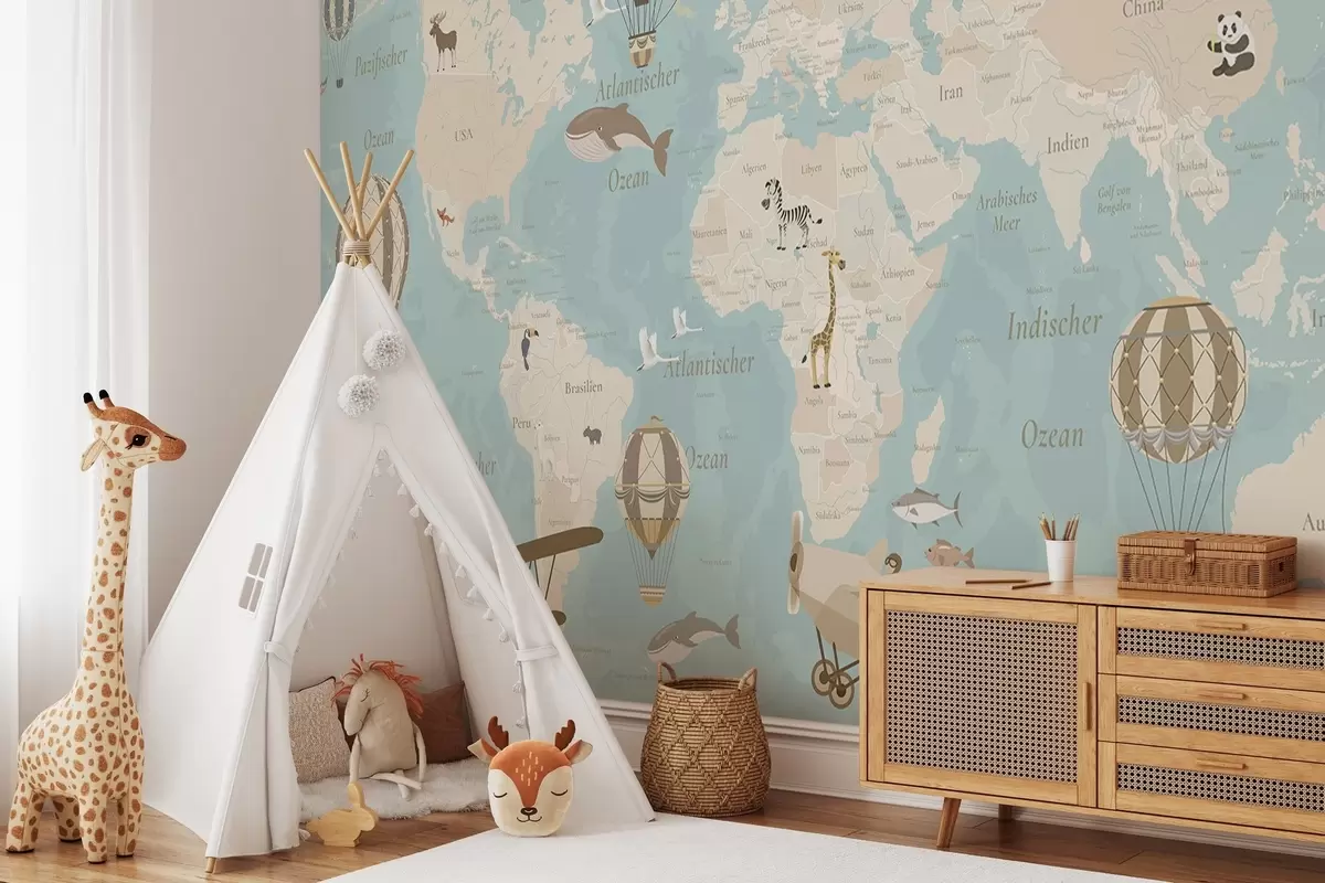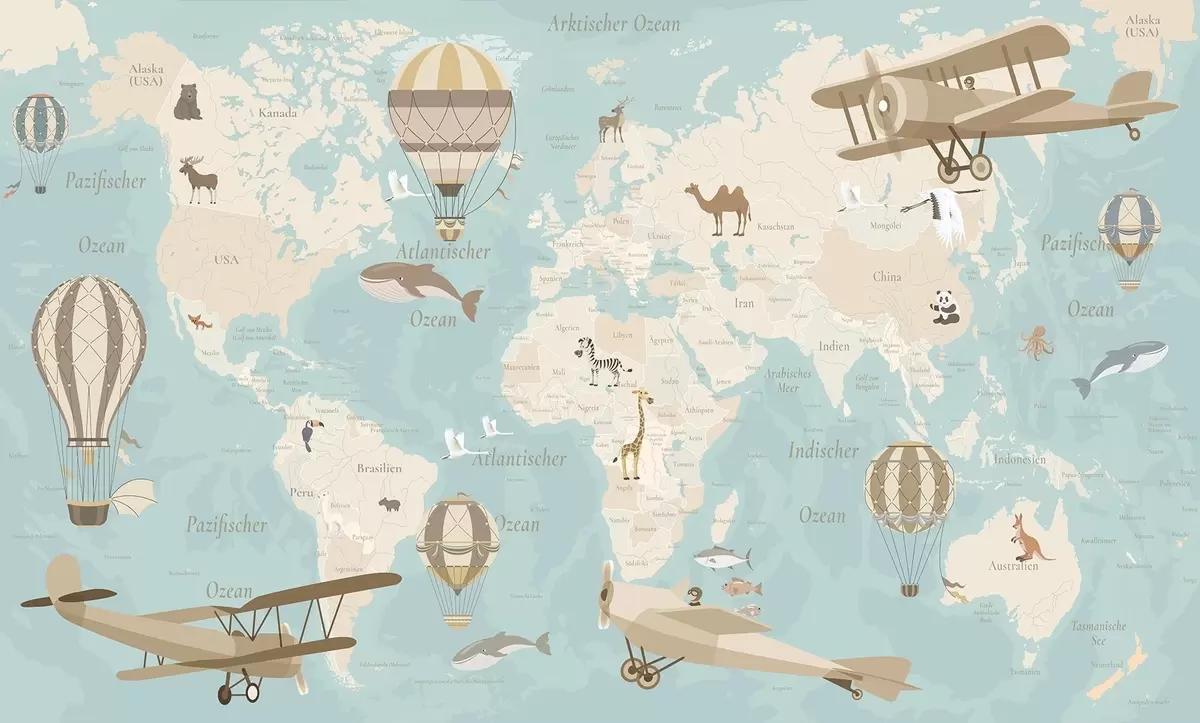 Valokuvatapetti Lasten maailmankartta, jossa on eläimiä, lentokoneita ja kuumailmapalloja. Saksankielinen. Sininen väri. Nr c00003dev1