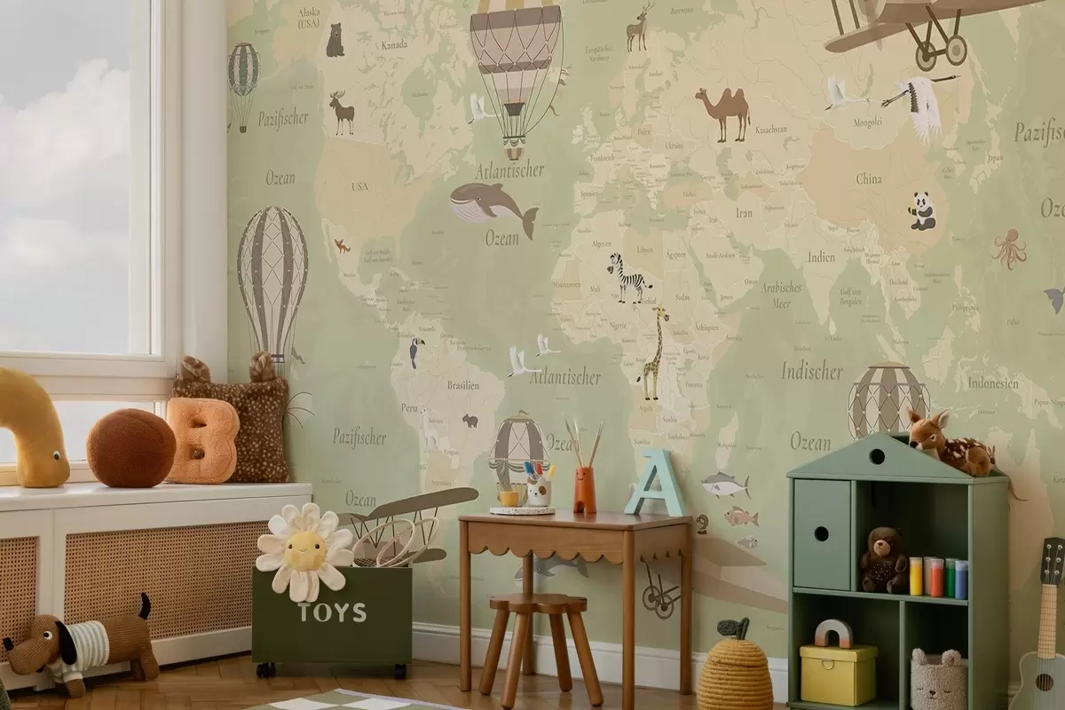 Valokuvatapetti Lasten maailmankartta, jossa on eläimiä, lentokoneita ja kuumailmapalloja. Saksankielinen. Vihreä väri. Nr c00003dev2