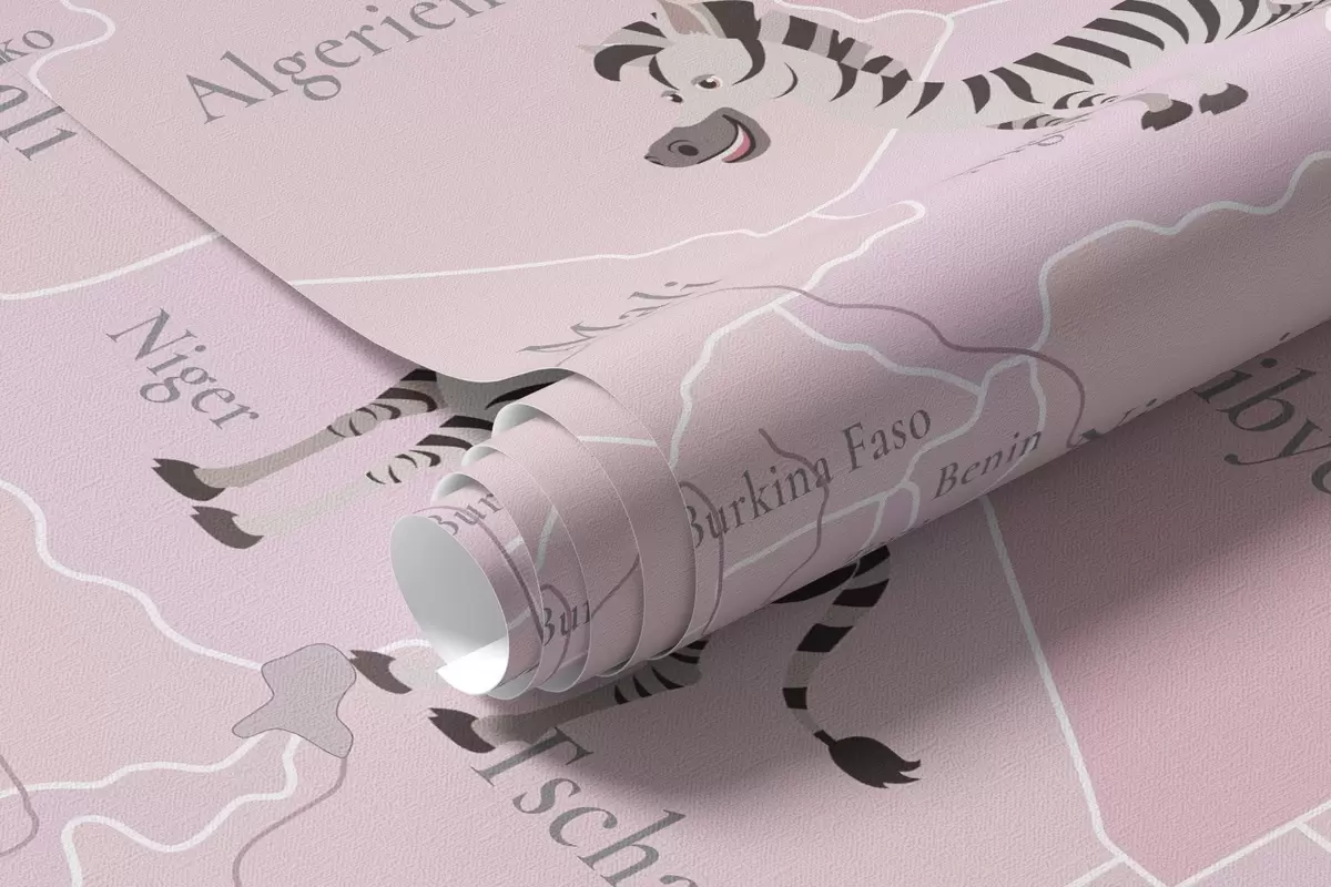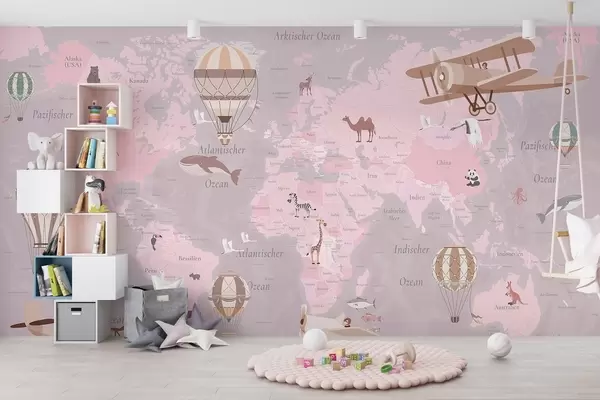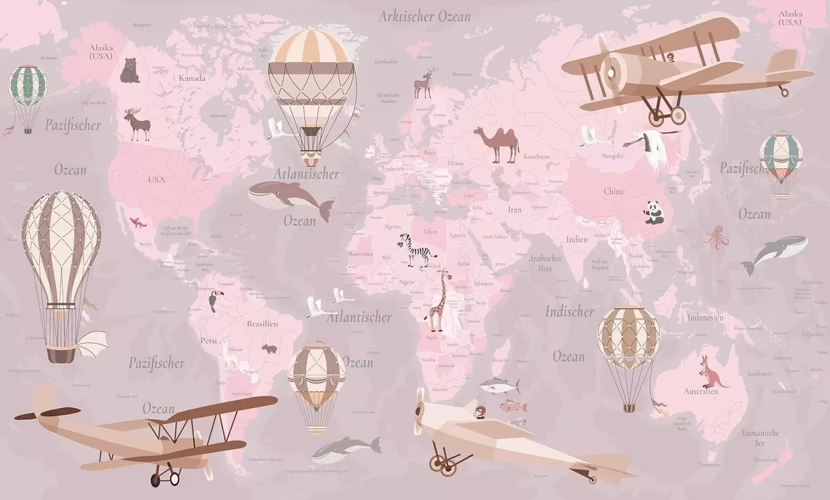 Valokuvatapetti Lasten maailmankartta, jossa on eläimiä, lentokoneita ja kuumailmapalloja. Saksankielinen. Vaaleanpunainen väri. Nr c00003dev3