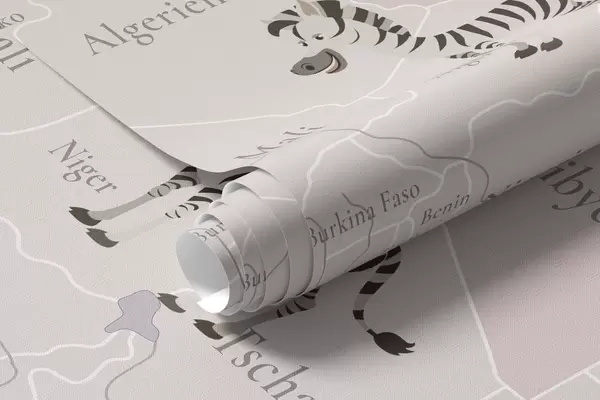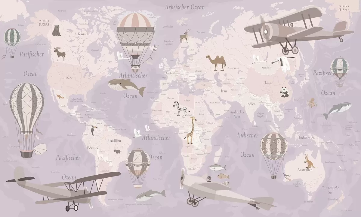 Valokuvatapetti Lasten maailmankartta, jossa on eläimiä, lentokoneita ja kuumailmapalloja. Saksankielinen. Violetti väri. Nr c00003dev4