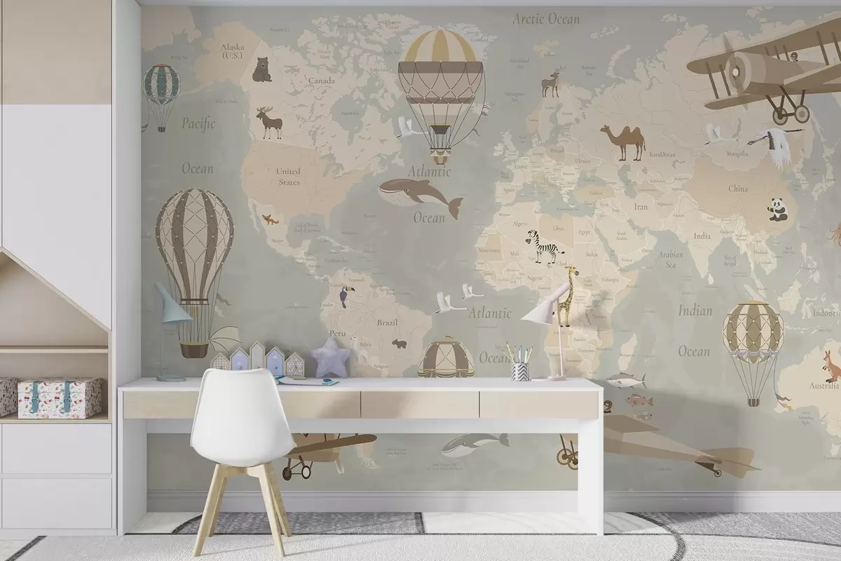 Valokuvatapetti Lasten maailmankartta, jossa on eläimiä, lentokoneita ja kuumailmapalloja. Englanninkielinen. Beige väri. Nr c00003en