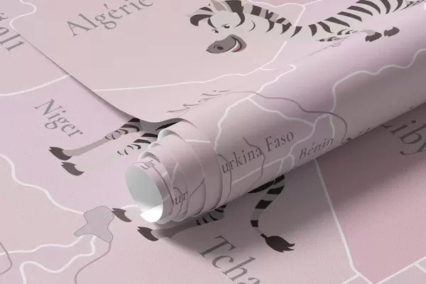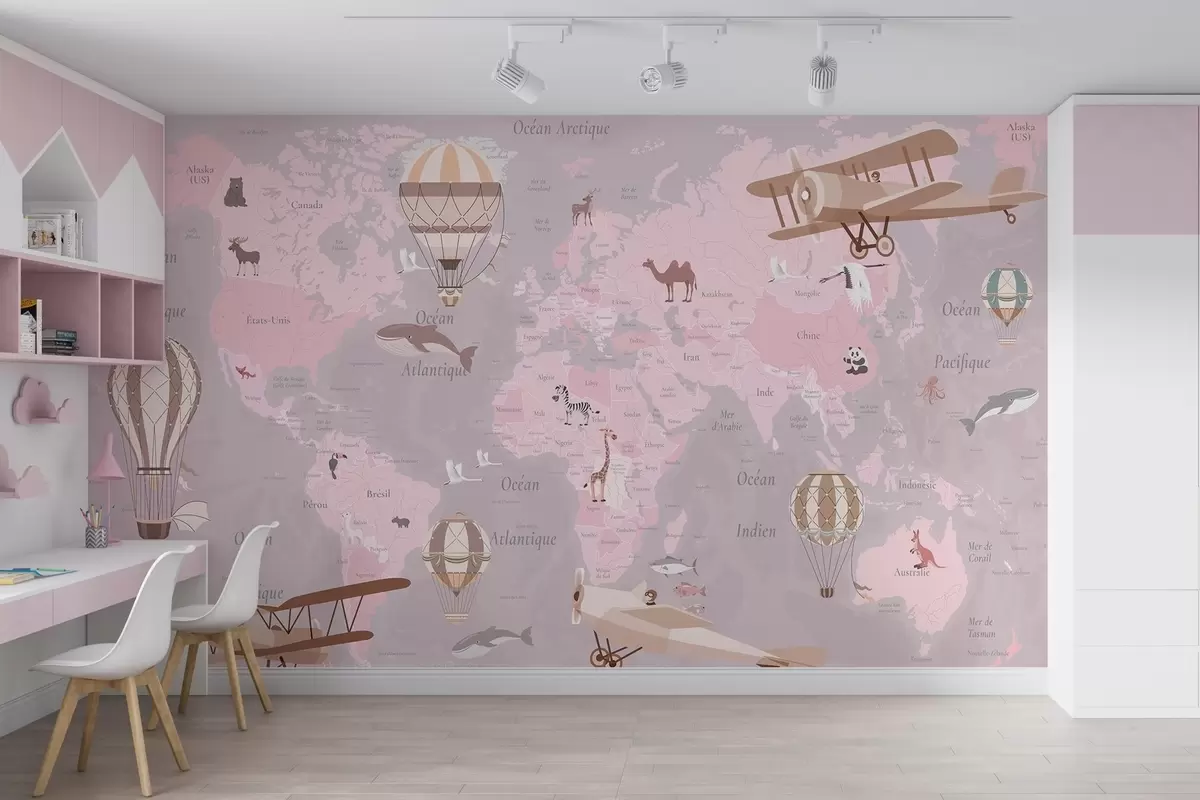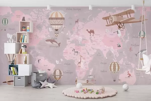 Valokuvatapetti Lasten maailmankartta, jossa on eläimiä, lentokoneita ja kuumailmapalloja. Ranskankielinen. Vaaleanpunainen väri. Nr c00003frv3